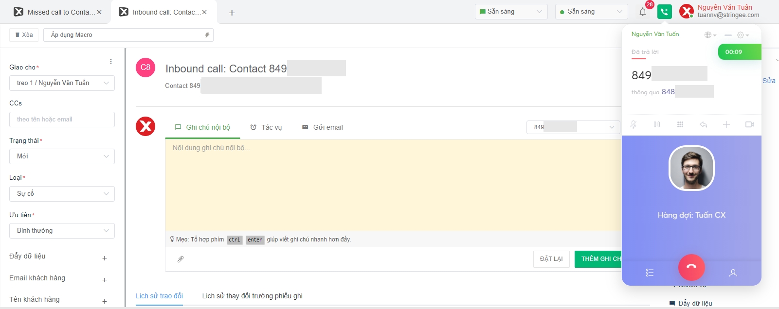 After receiving call, a call ticket will be displayed on the screen. In addition, this customer's contact details (if any) will be displayed in the right part of the screen, helping the agent immediately get customer details as well as previous records (if any).