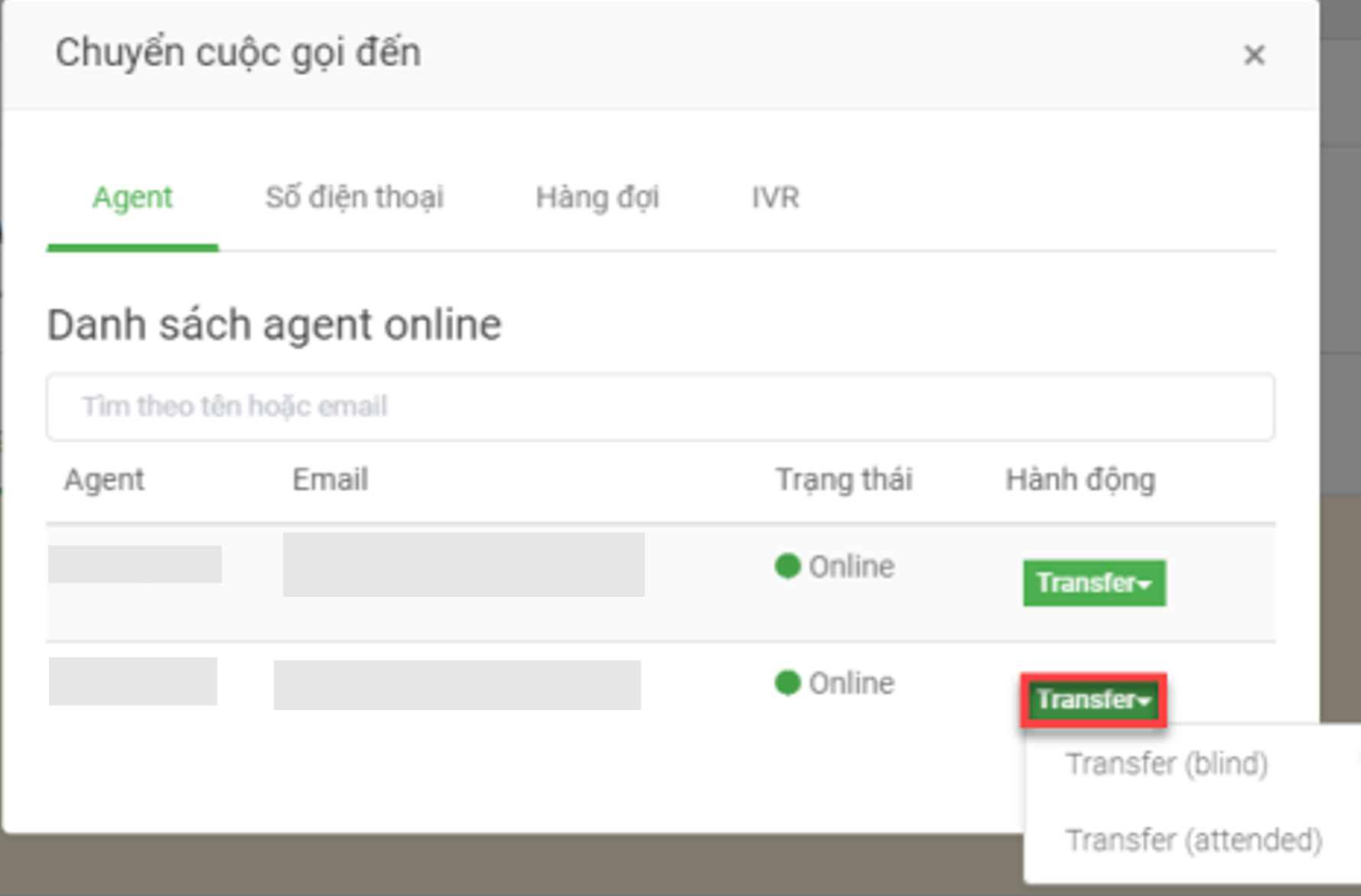 During the conversation with the customer, agent A may need to transfer the call to another person as required by the procedure. StringeeX contact center supports agents to transfer calls to many different directions: