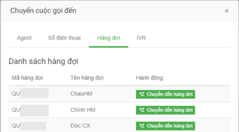 Queue: It applies to the case when an agent A needs to transfer calls to another business unit by transferring to the corresponding queue for that business unit. After transferring, the agent A is disconnected from the call. Then the call is transferred to the target queue and distributed according to the rules of the queue. Agent selects queue and clicks "Transfer to queue" to transfer the call.