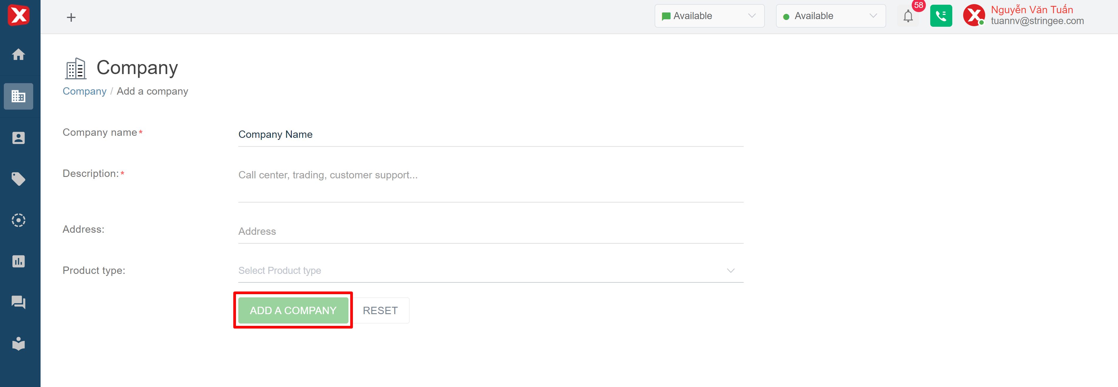 Depending on the information fields that have been configured in the [Company configuration](https://help.stringeex.com/stringeex-tong-dai-cham-soc-and-quan-ly-khach-hang/en/ii.-system-features/9.-settings/9.3-field-configuration/9.3.1-contact-field) section, the admin fills in the corresponding information and clicks on the "Add a company" button (the icon will light up when the required information is filled) to initialize.