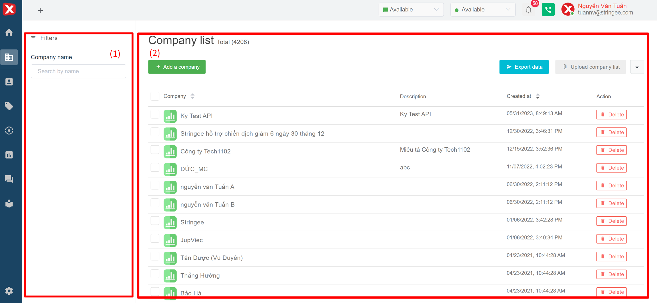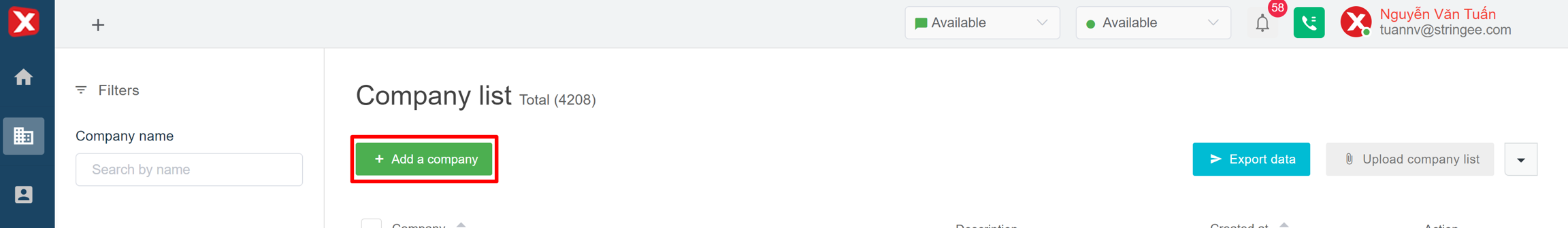 Upload companies: StringeeX supports business creation in bulk from an existing excel file, users (admin) click to download the excel file with sample fields, enter information (in text format) and upload to the system to create businesses in bulk.
