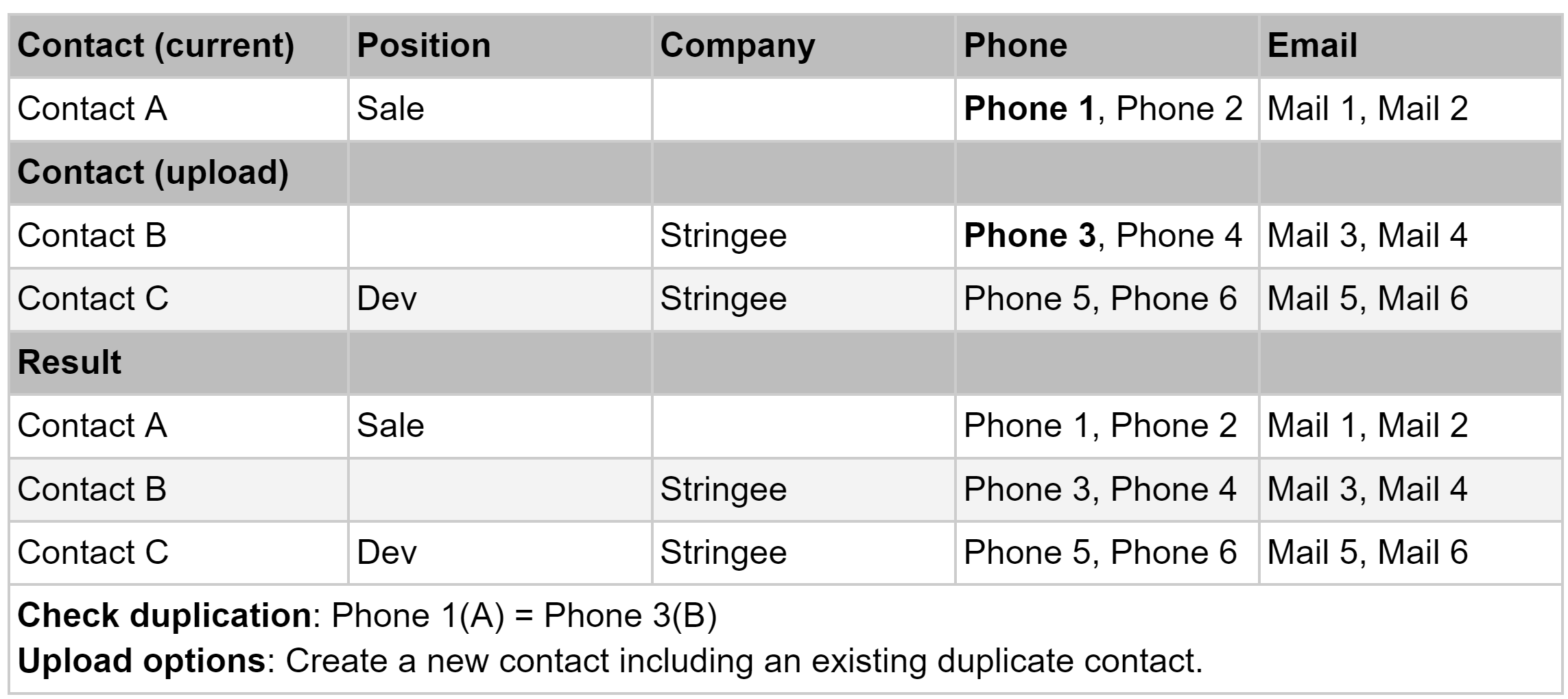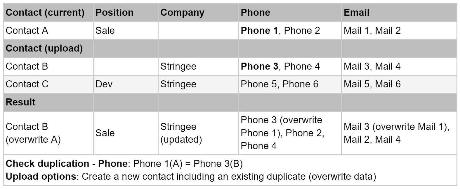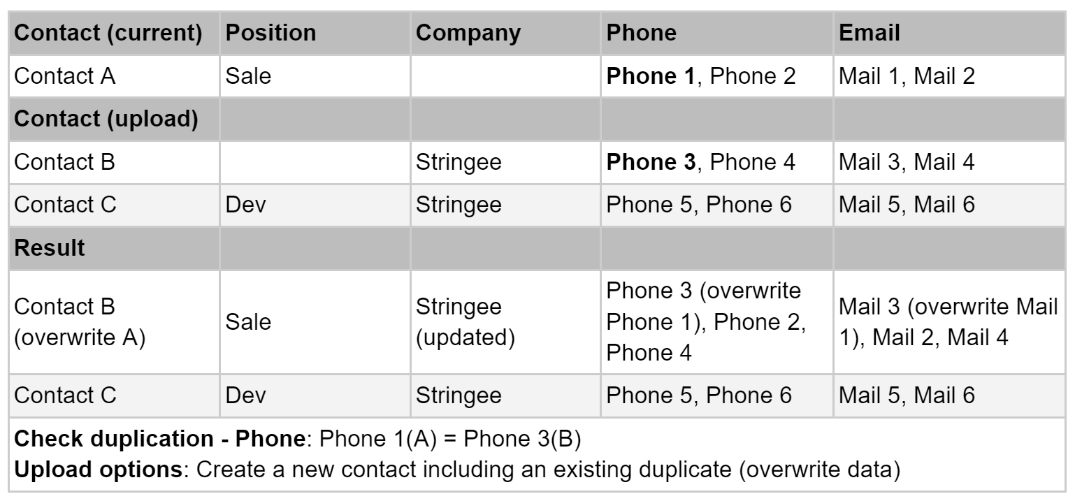 Create new and update existing duplicate contacts (overwrite data): Upload a new contact, update the empty information, and overwrite the first record with the contact with the same selected data