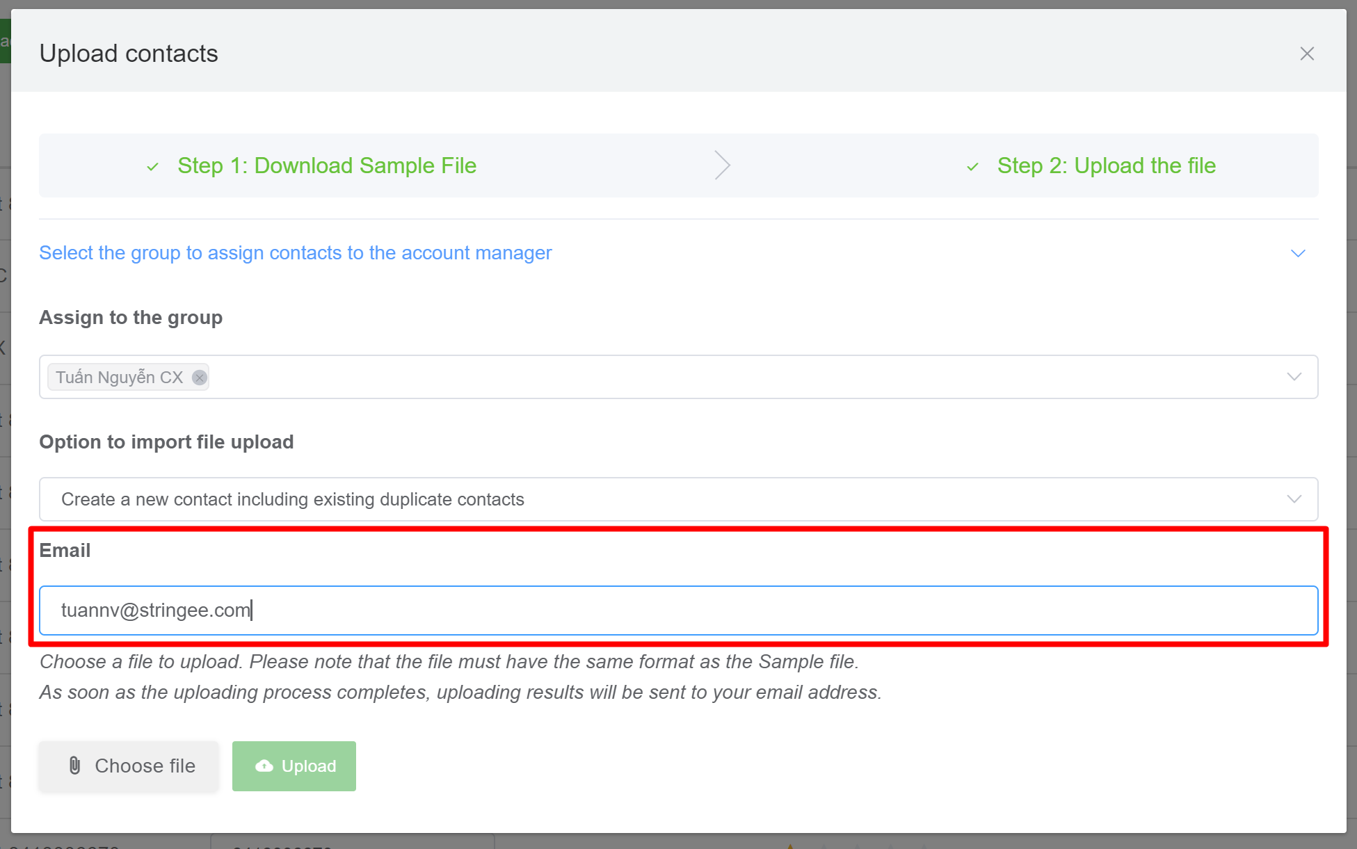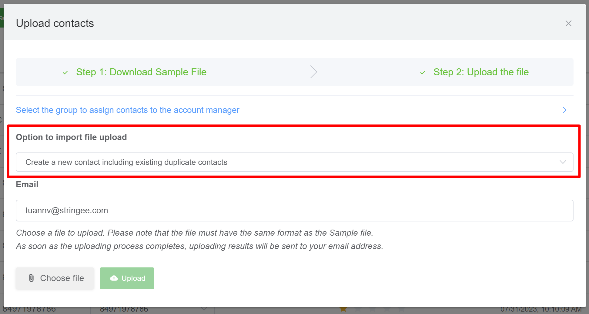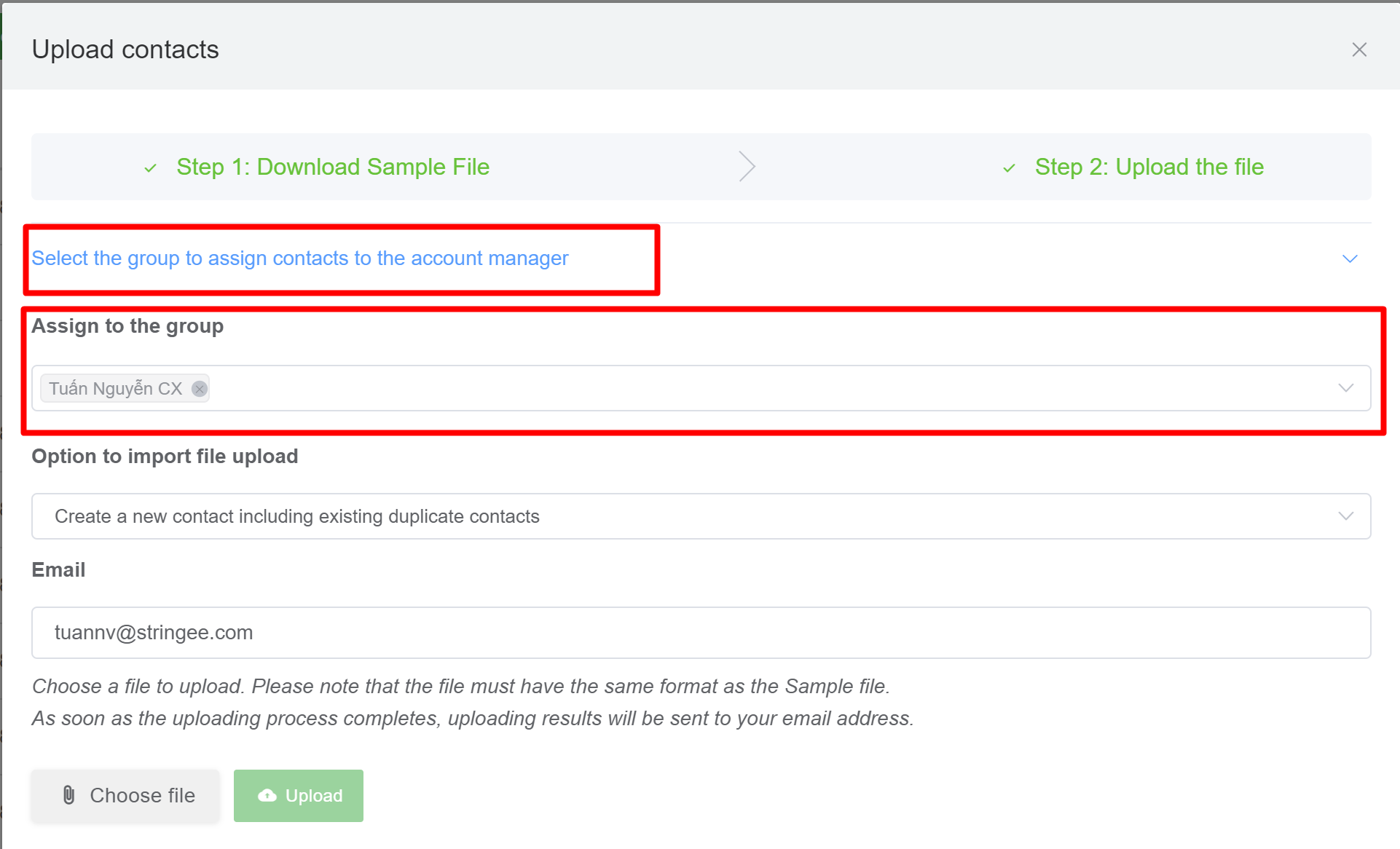 StringeeX allows users to upload contacts to the manager (supervisor) in the group. When uploading, users click "Select group to assign contacts to account manager"