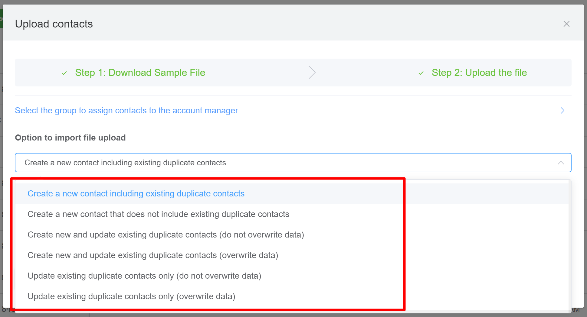 Create a new contact including existing duplicate contacts: Allows uploading of new contacts and contacts with existing data