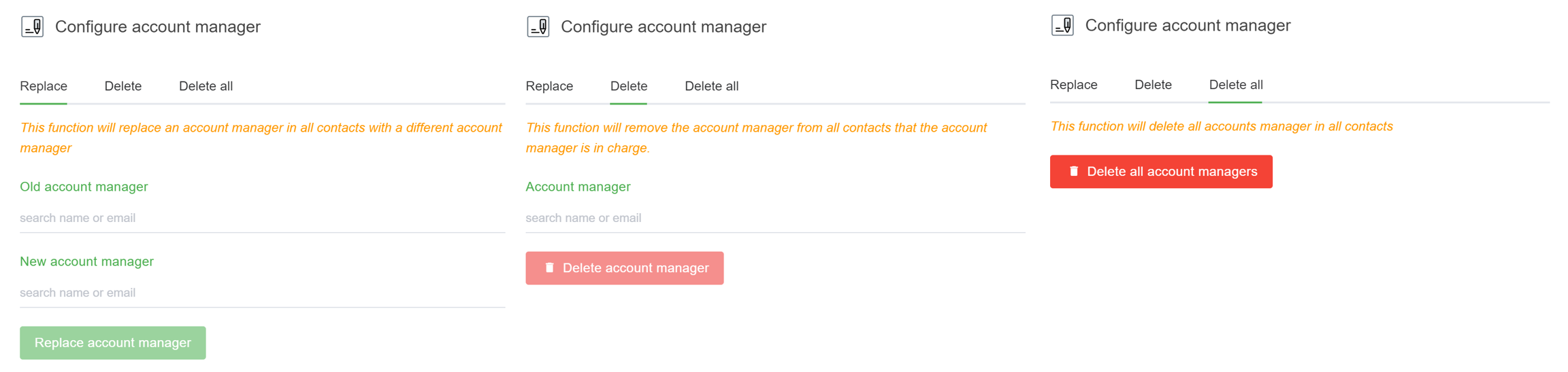Delete: This function will delete the account manager in all the contacts belong to this account manager