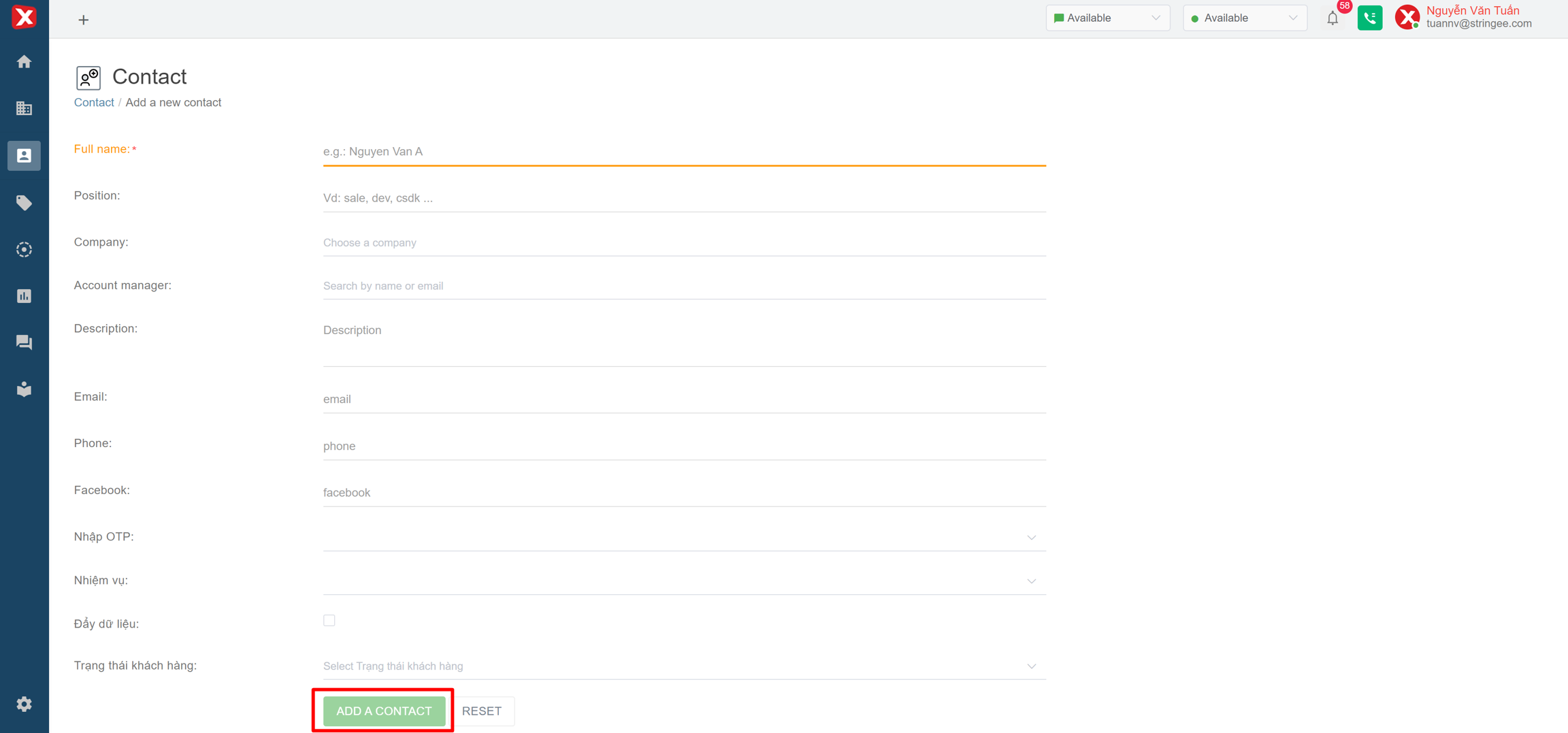Depending on the information fields that have been configured in the contact field configuration (see more in the contact field configuration), the admin fills in the corresponding information and clicks on the “Add to contact” icon (the icon will light up when all required information is filled) to create.