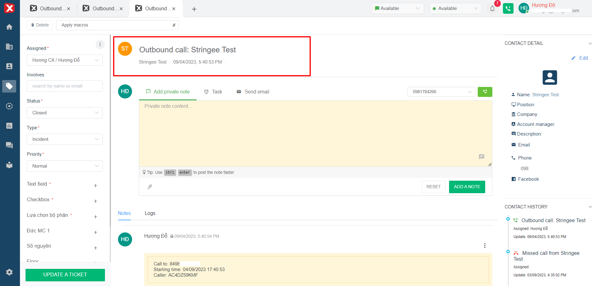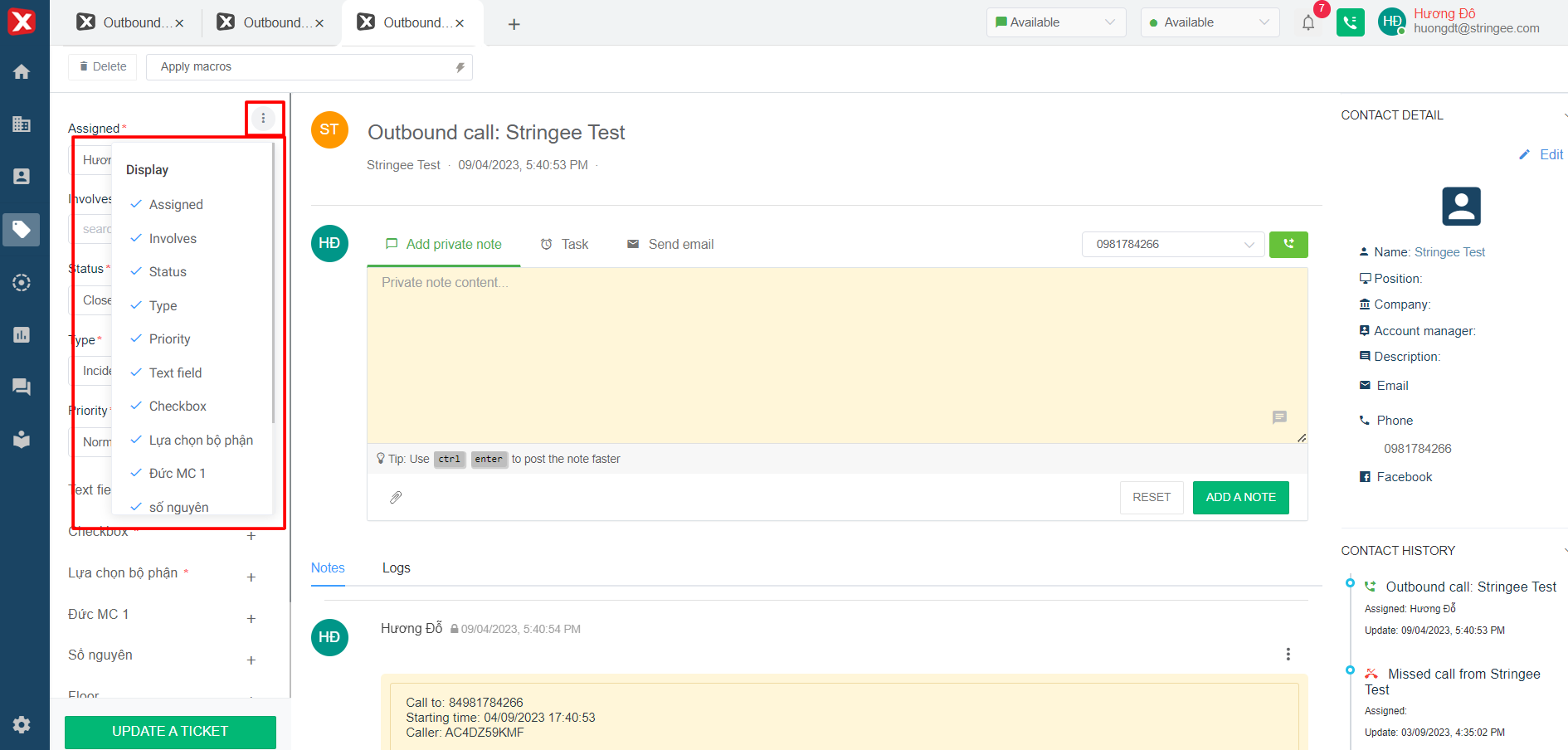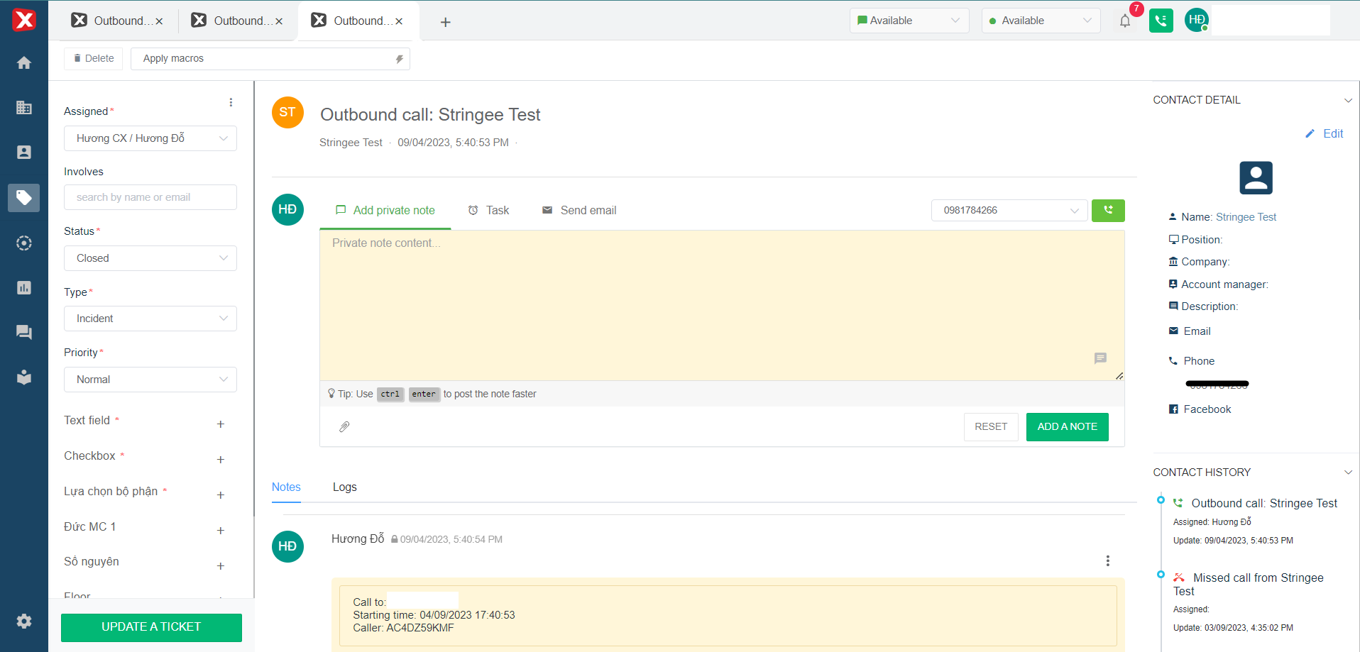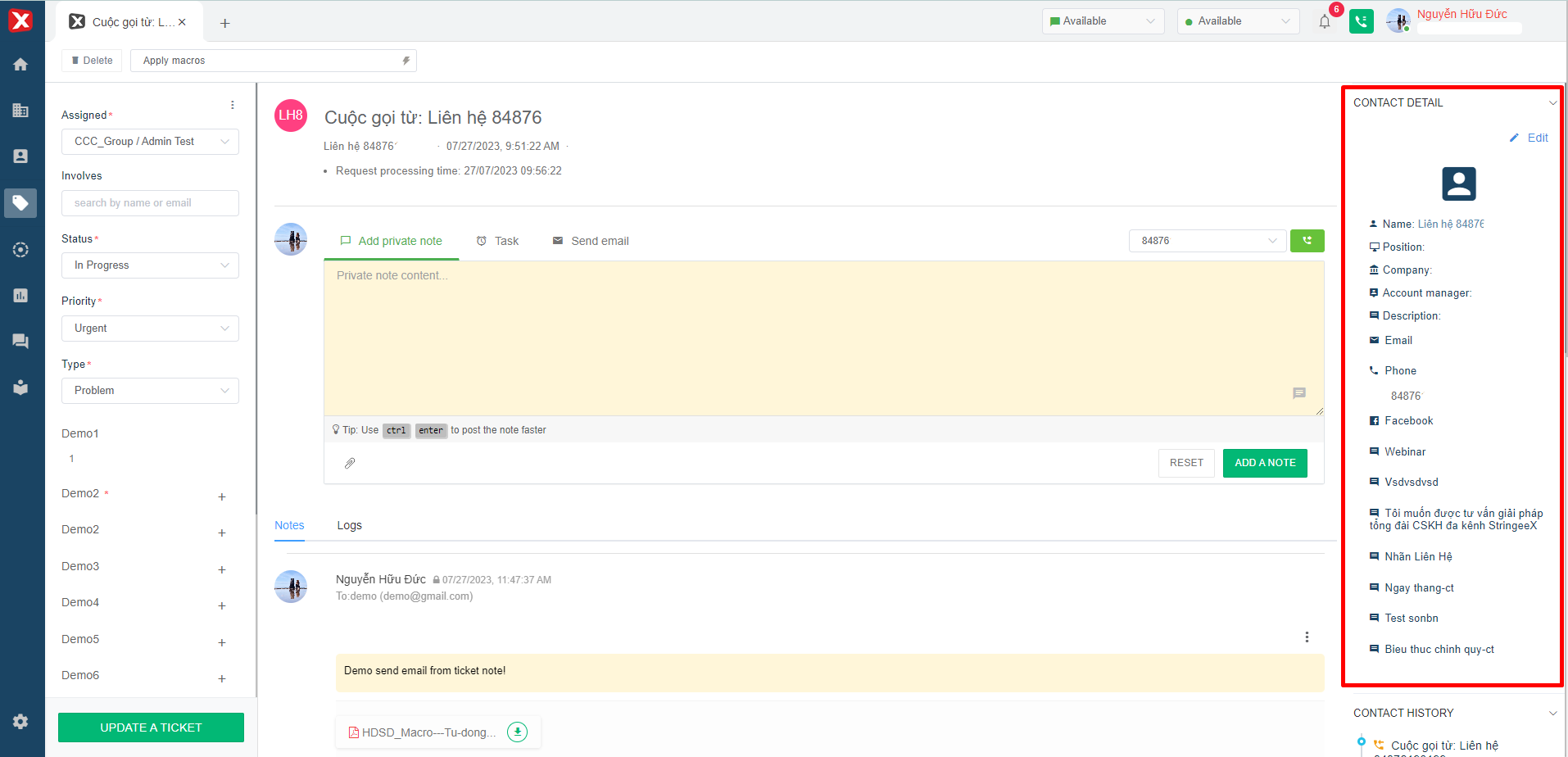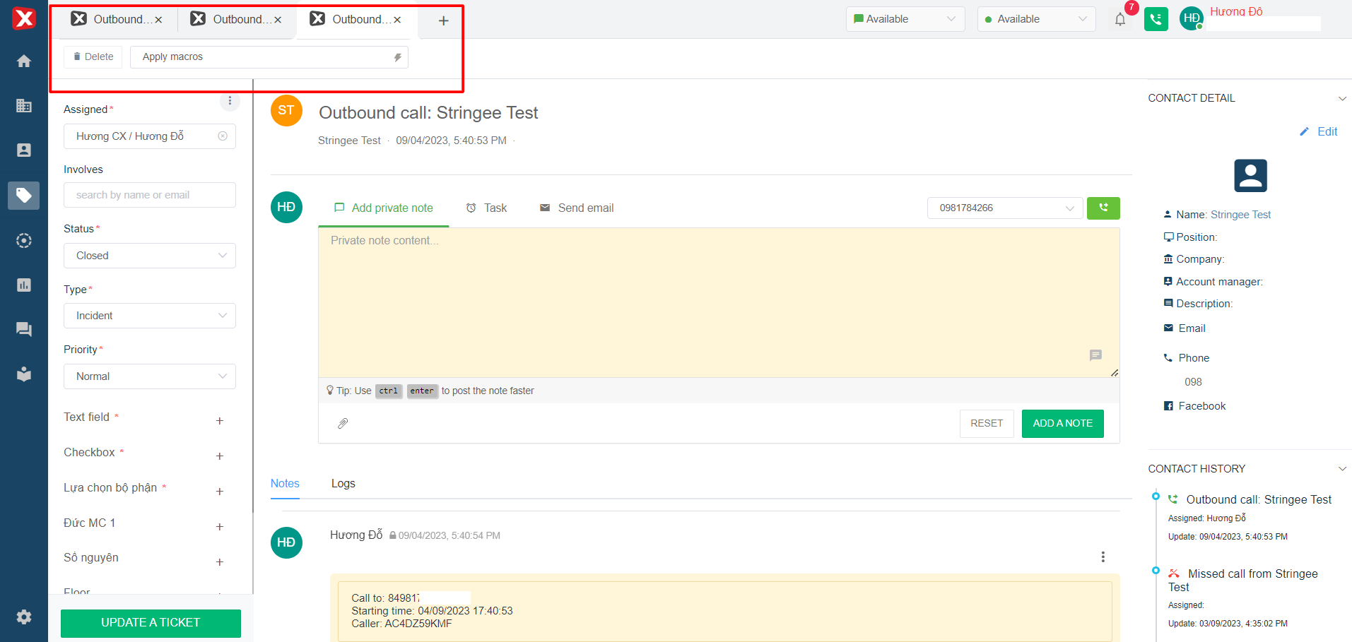 * **Apply** [**macro**](https://help.stringeex.com/stringeex-tong-dai-cham-soc-and-quan-ly-khach-hang/en/ii.-system-features/9.-settings/9.1-service-management-customer-service/9.1.5-ticket-configuration/marco)**:** The user can apply the created macro to the currently opened ticket.