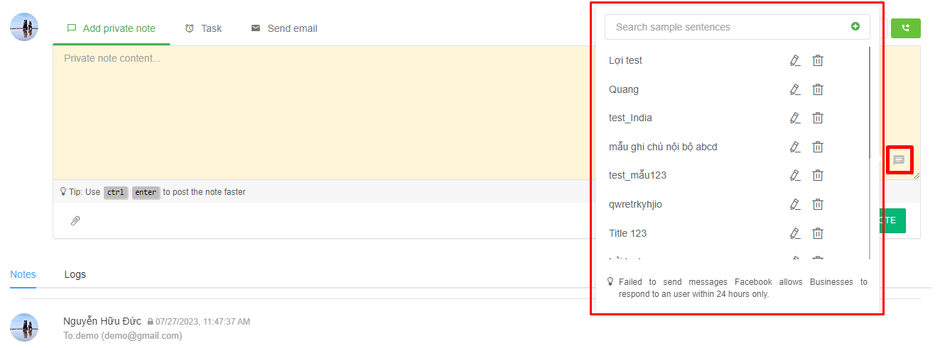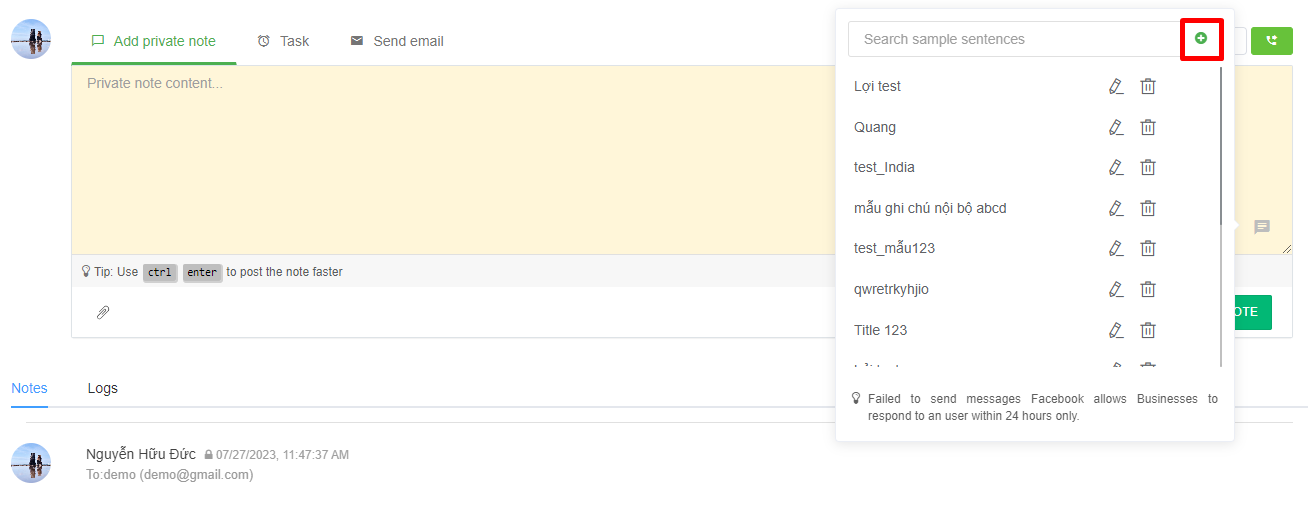 * **Sample notes:** are pre-made templates. Users can select those samples to insert directly into the content of internal notes, tasks, and email.