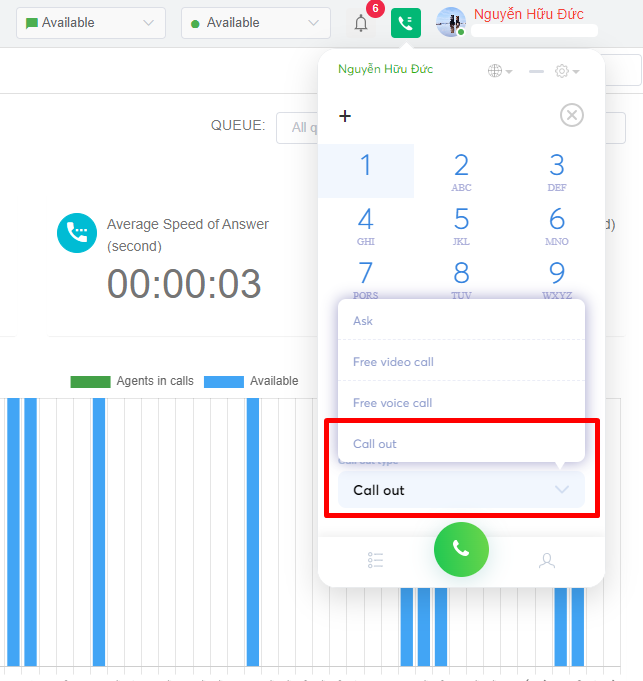 To make an outbound call to a customer, the user presses the call icon as shown in Figure 12. When making an outbound call, if there are multiple hotline numbers on the system, the system will ask the user to select the number as shown in the image 13.