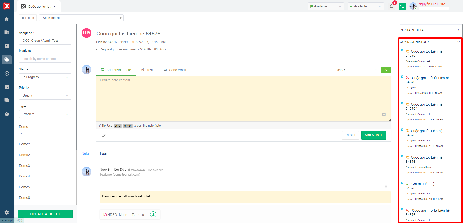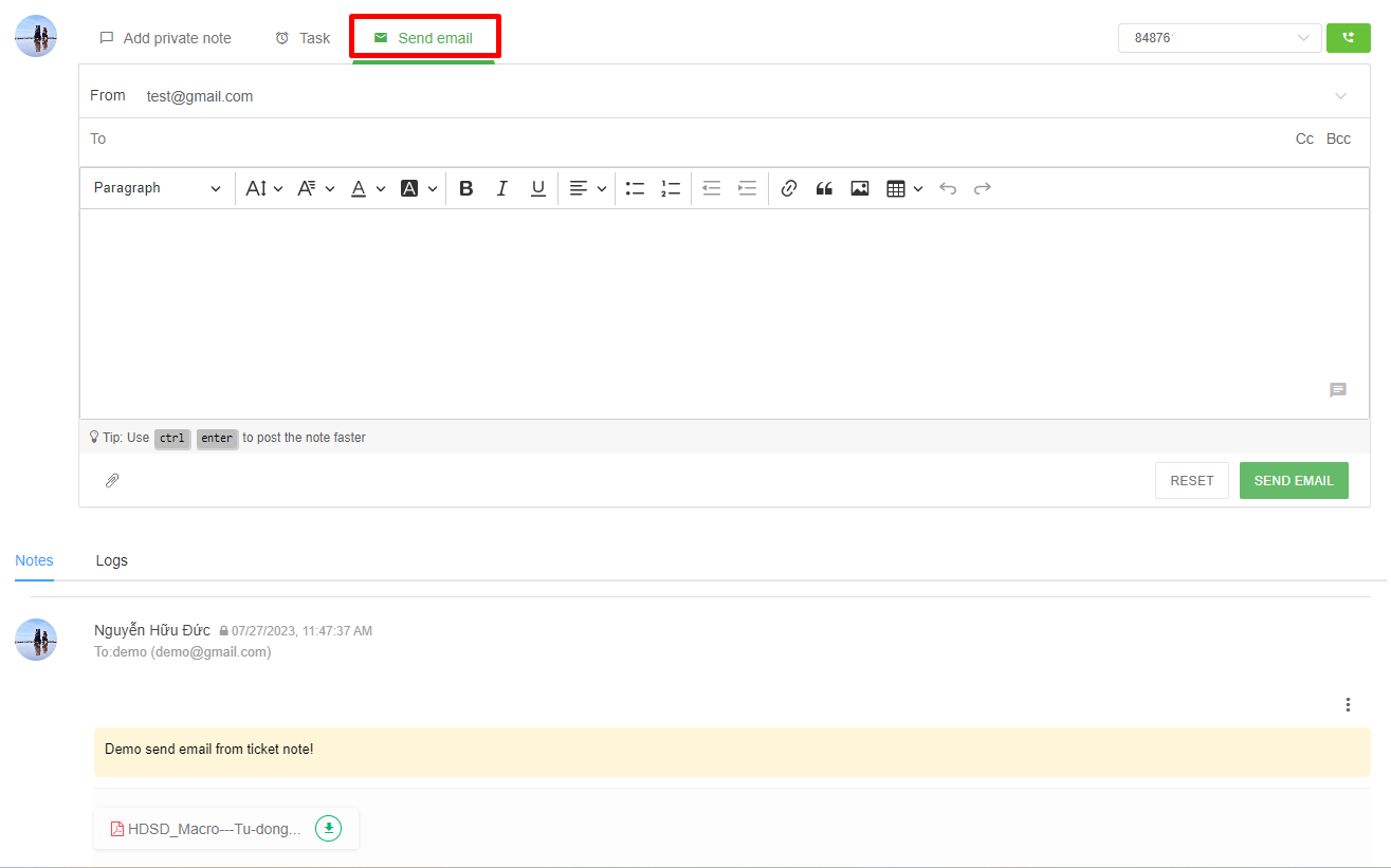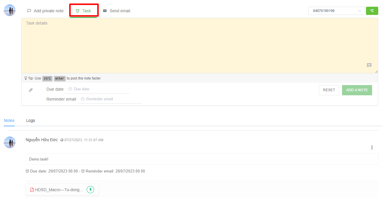 &#x20;     **- Remind email:** The system will automatically send a reminder email to the email of the user who created the task in the ticket at the set time => After pressing the "Add a note" button, the task content will be saved in the Notes section as shown in image 8.