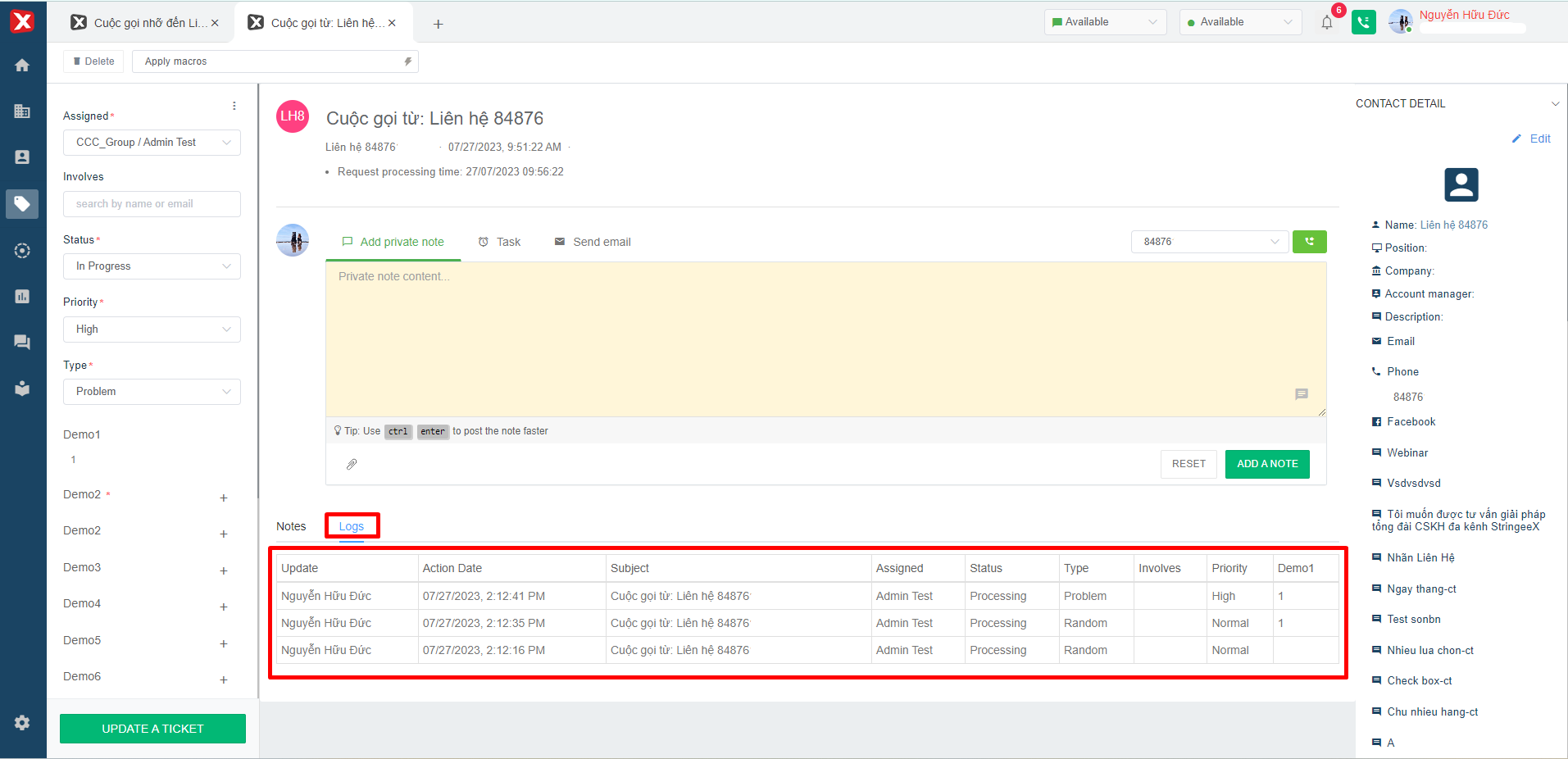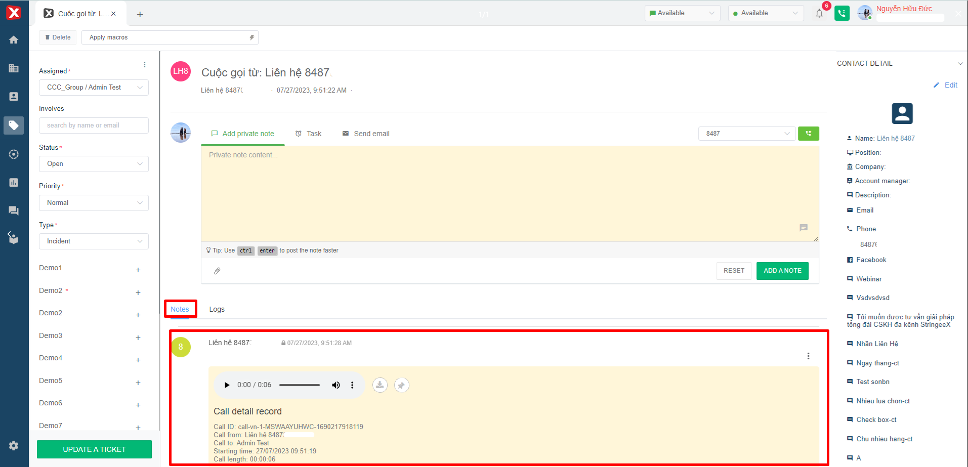 * **Internal note: h**ere the user will enter the content in the internal note box and then click "Add a note" then the system will record the content in the "Notes" section as shown in Image 7.