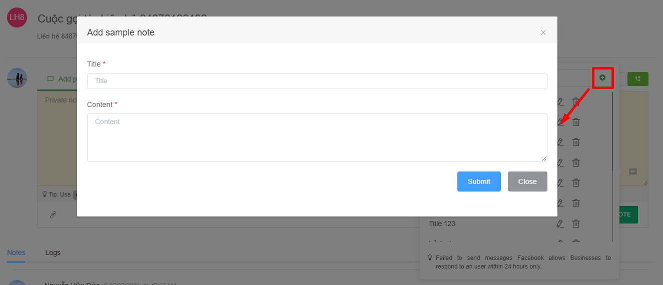 When the user enters the content to respond to the Customer and presses the reply button, the message will be sent to the customer's chat channel (Facebook, Zalo, Livechat) according to the entered content and will be saved in Notes as shown in Image 10.