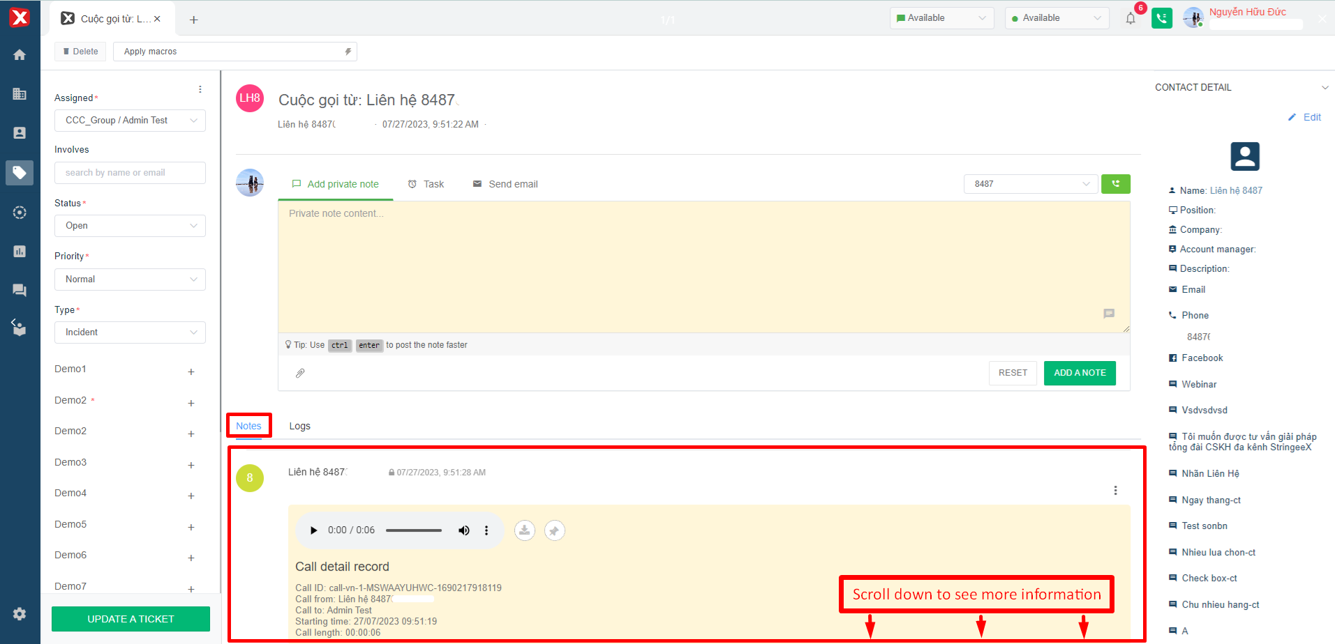 After making a call, the system will not create a new ticket. The call details will be saved in the Notes section of the ticket.