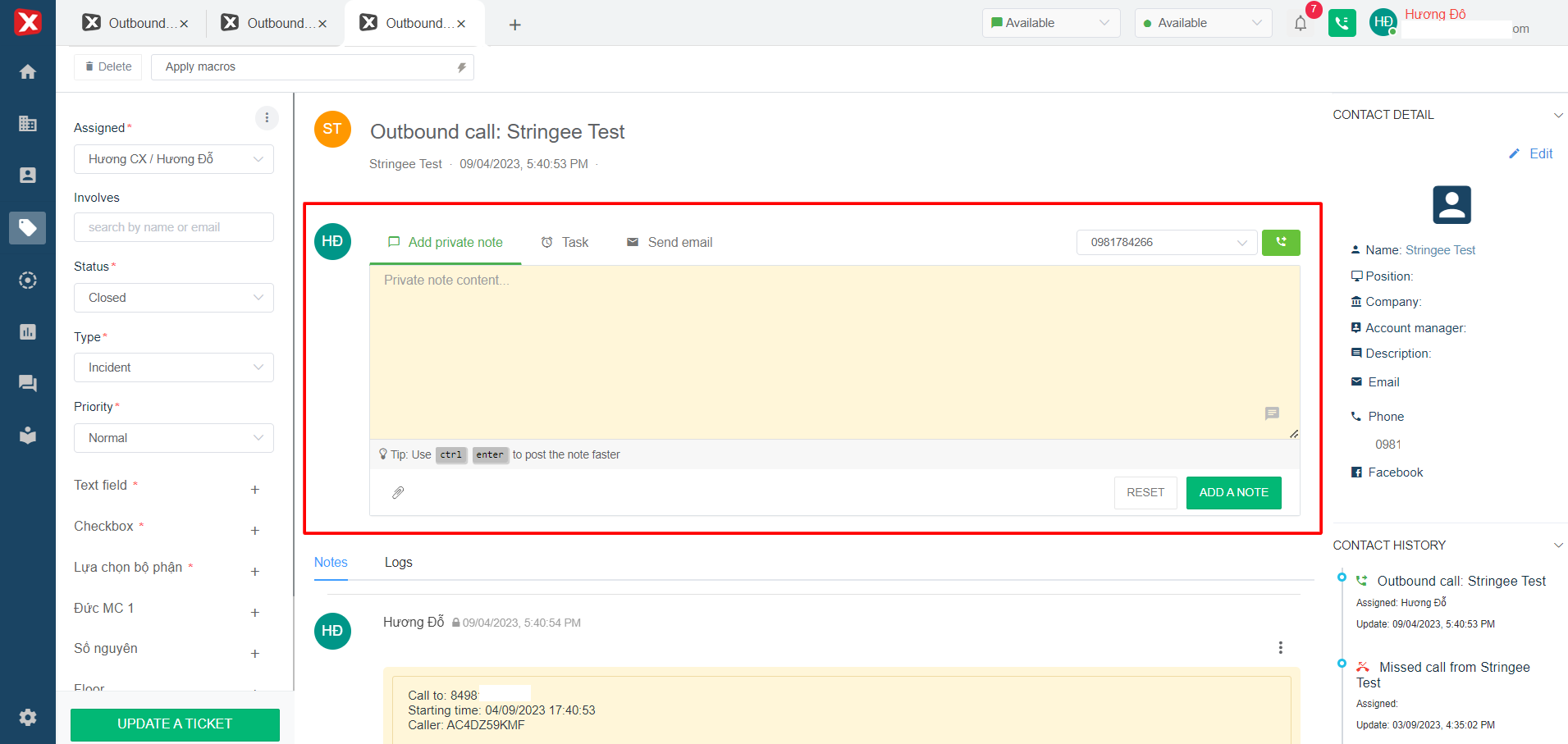 * **Calling out to Customer from the ticket:** For the tickets including Customer's phone number in Contact Details section, the user can make a call to the Customer right from the ticket. Note: When the customer is the customer's phone number, to make a call to the agent, you need to choose the type of call out at the web phone (just choose not to dial the number manually) named "Call out".