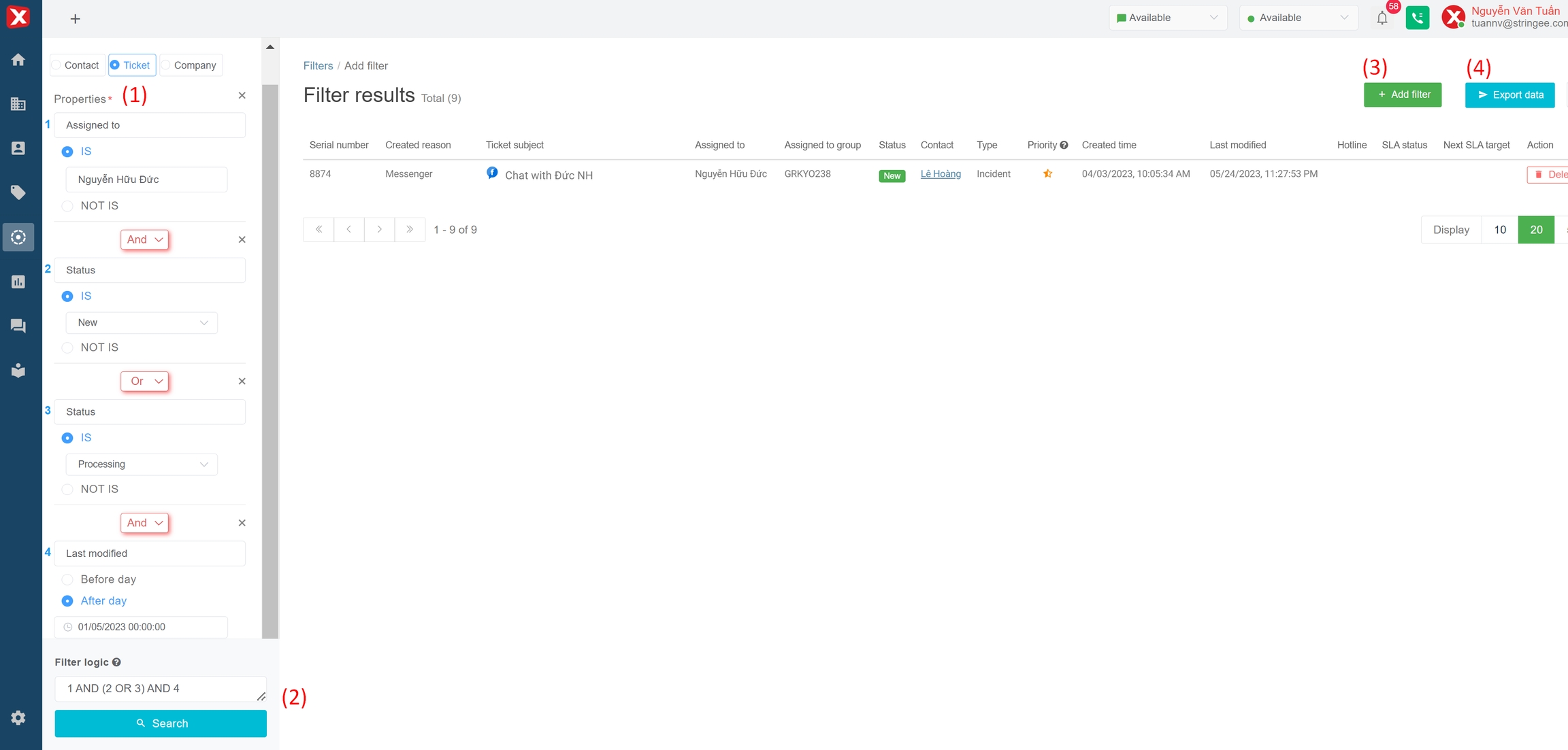 For example: In the figure, create a ticket filter with the following logic: The tickets are assigned to the agent named Nguyen Huu Duc (condition 1), the ticket status is new (condition 2) or the ticket status is processing (condition 3). These tickets were last updated after 00:00 on May 1st, 2023.