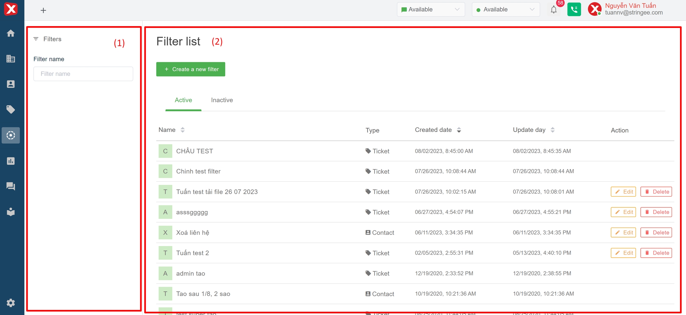 StringeeX has designed a smart search filter on the ticket interface, contacts and companies, helping users to quickly search and filter results by specific fields.