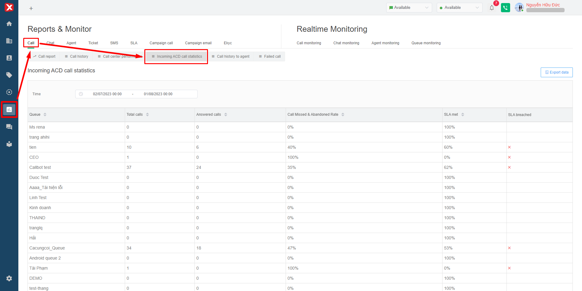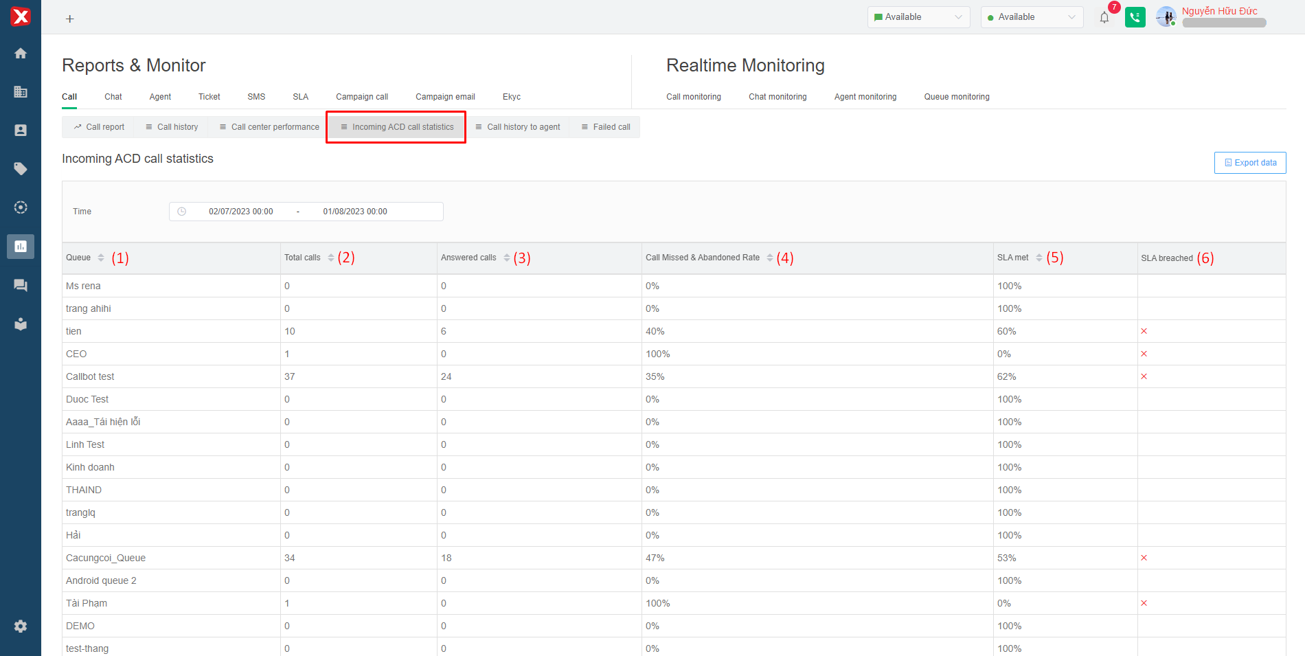 **(5) SLA met:** The rate of calls reaching the [SLA](https://help.stringeex.com/stringeex-tong-dai-cham-soc-and-quan-ly-khach-hang/en/9.-settings/9.1-service-management-customer-service/9.1.4-configure-receiving-channels/channels/queue#cau-hinh-hang-doi) of the queue (total SLA calls/total calls to the queue).&#x20;