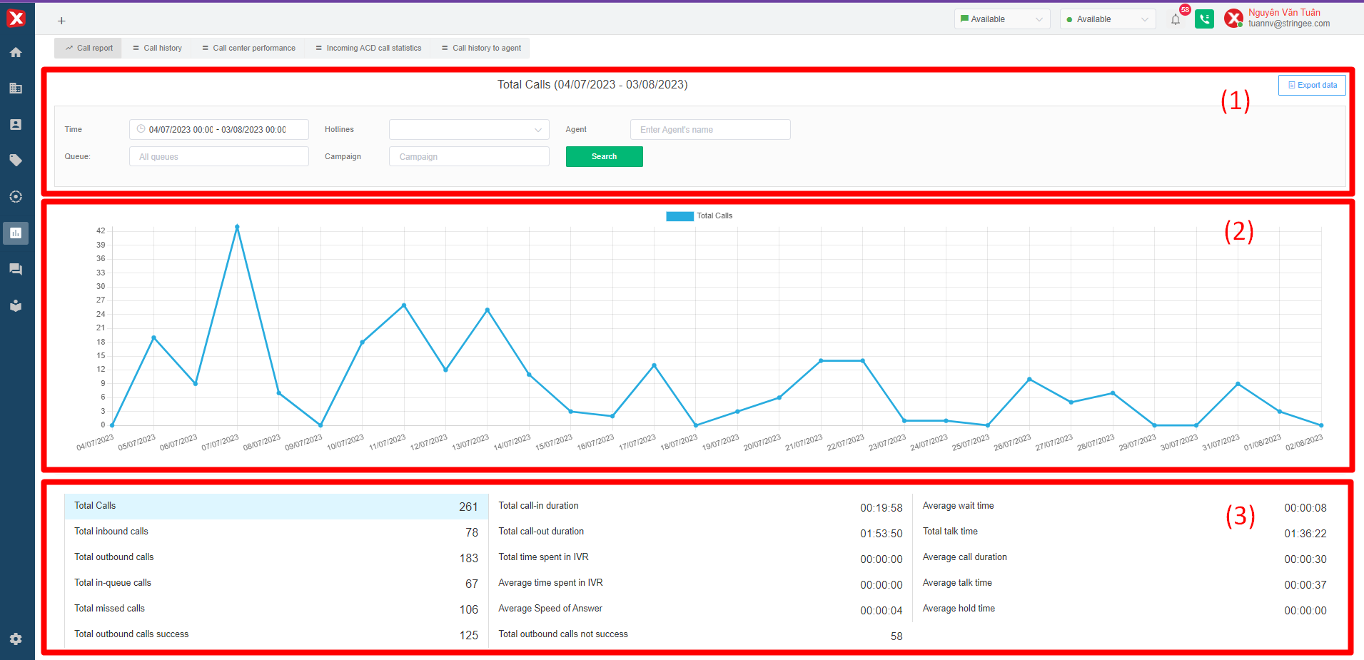 Total time of inbound calls: the total time of all incoming calls, from the time the call is connected to the contact center to the call end, including IVR waiting time (if any) and phone waiting time (if any)