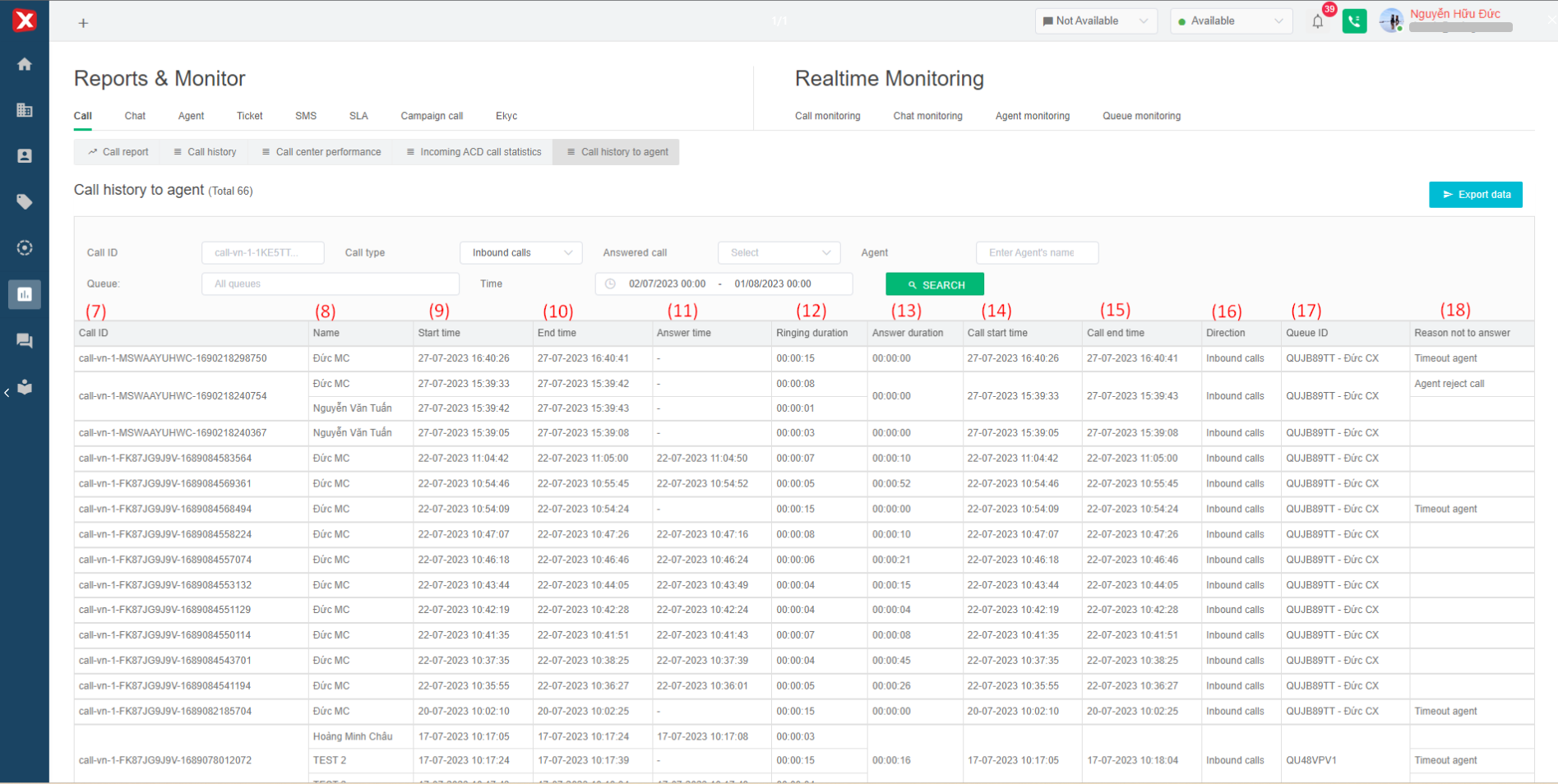 <figure><img src="https://content.gitbook.com/content/W1nWhVvoi55dxT8euy3M/blobs/27Yp1rHfxJxdWh6dRI1w/image.png" alt=""><figcaption><p>Image 4: Fields of reports on call distribution history to agents</p></figcaption></figure>