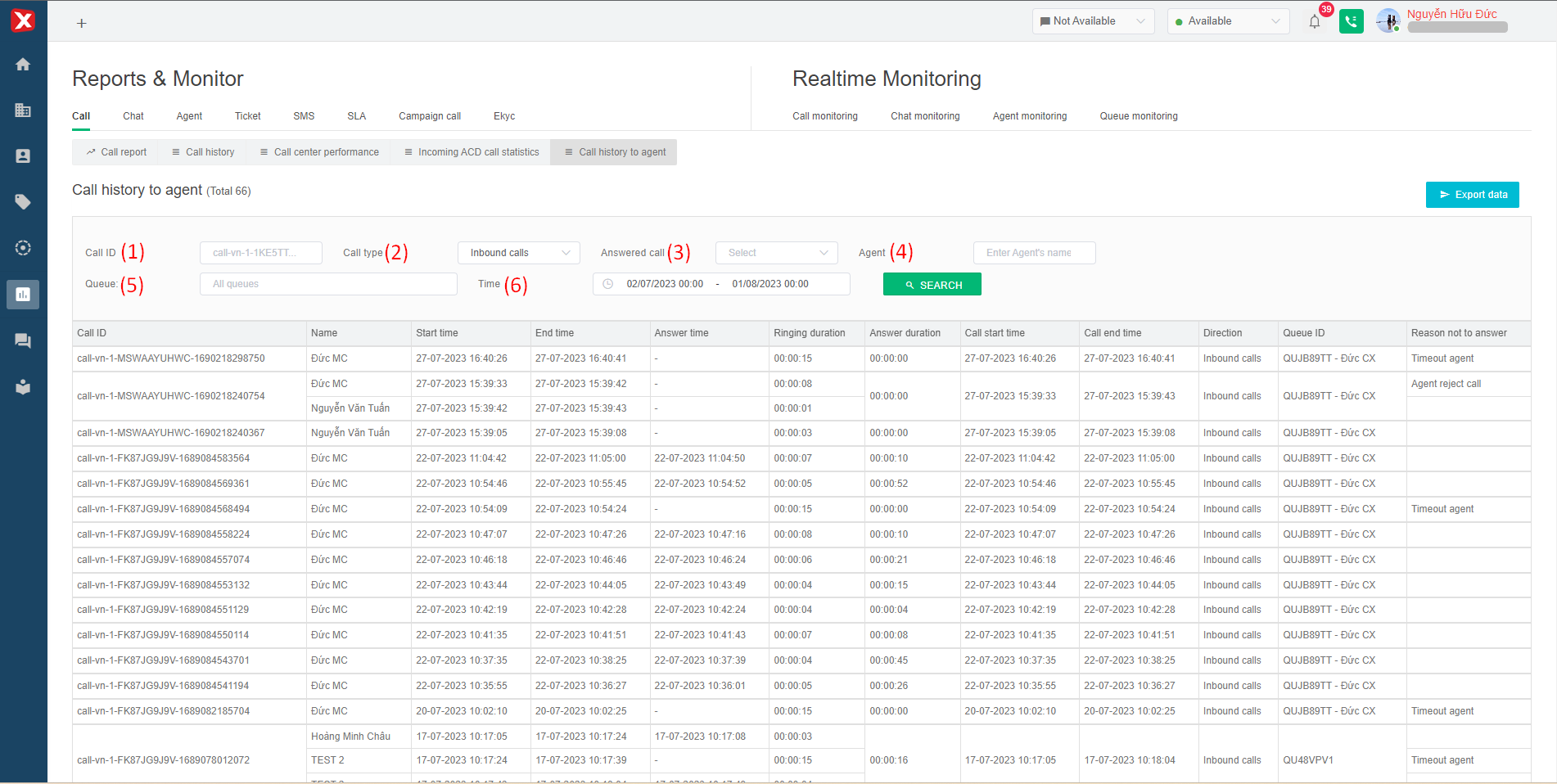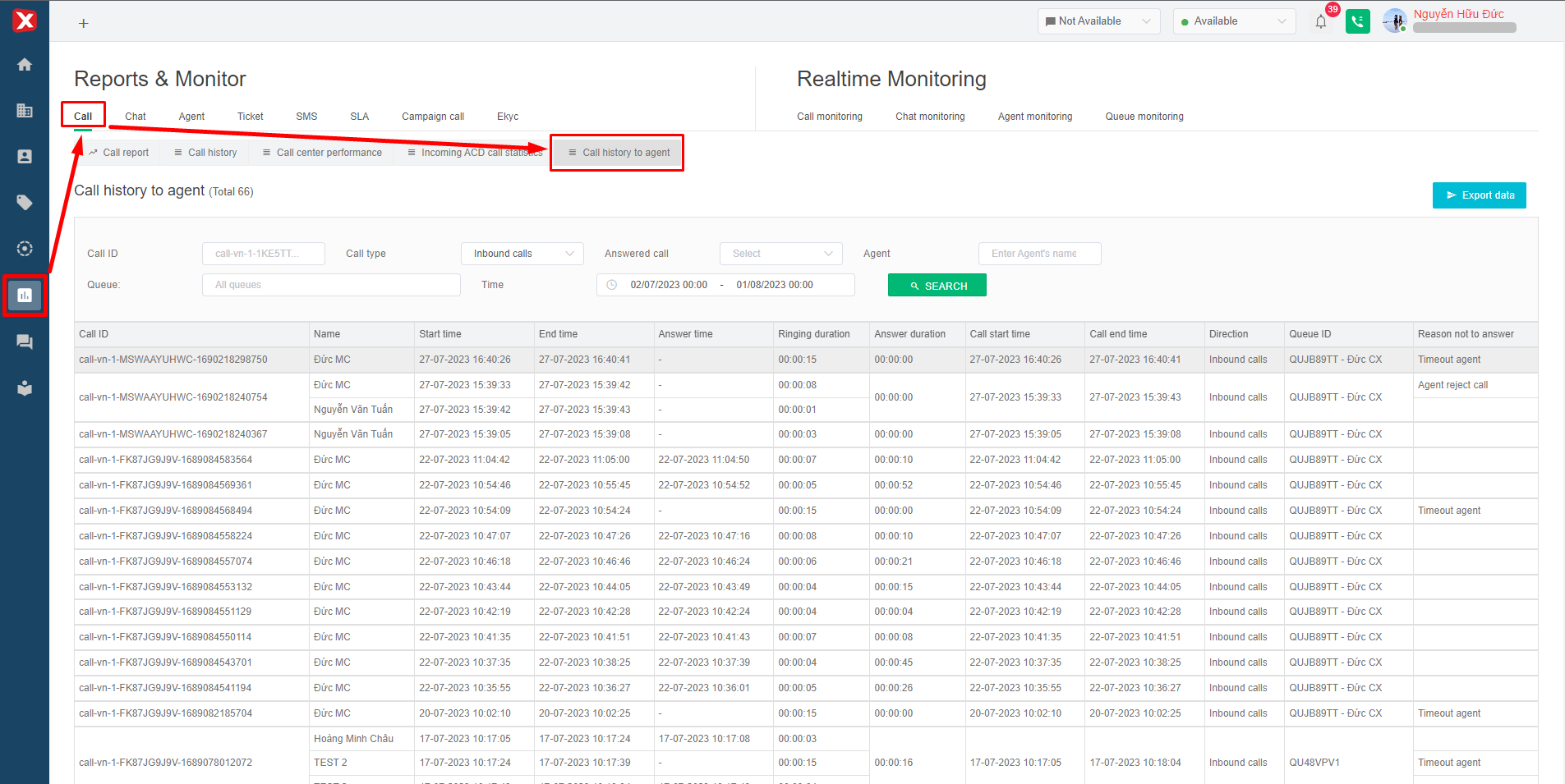 <figure><img src="https://content.gitbook.com/content/W1nWhVvoi55dxT8euy3M/blobs/2qEW4zQA50IJyhc0z7qP/image.png" alt=""><figcaption><p>Image 2: Agent Filter of call distribution history to Agent</p></figcaption></figure>