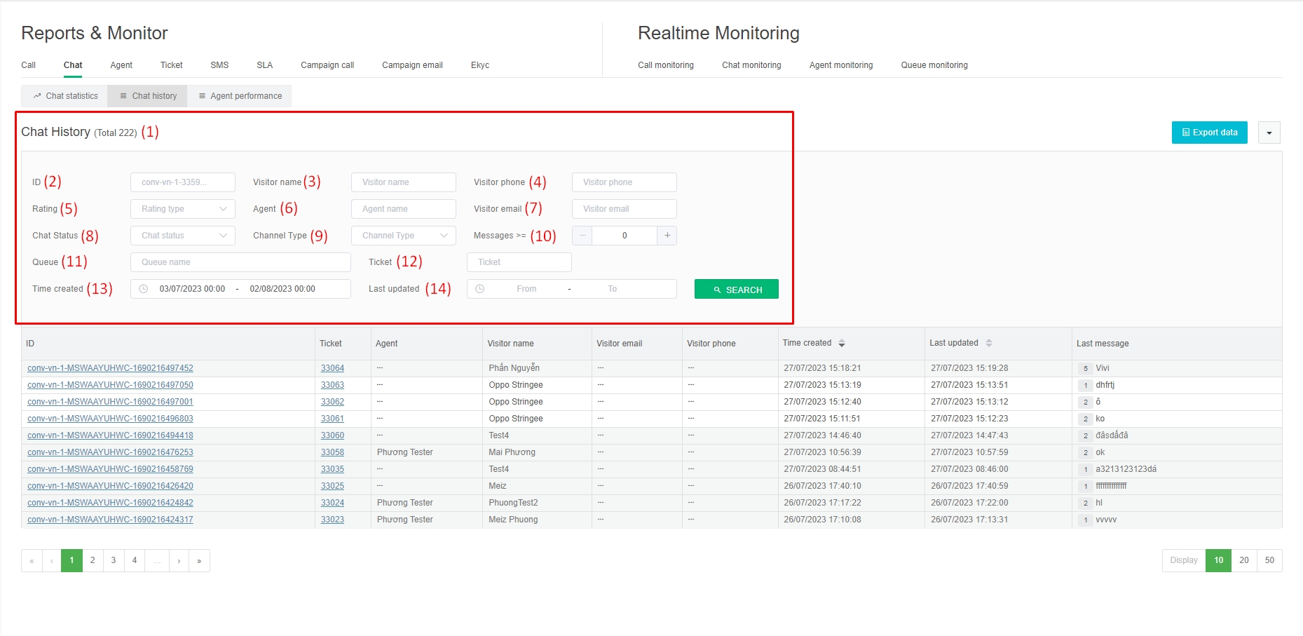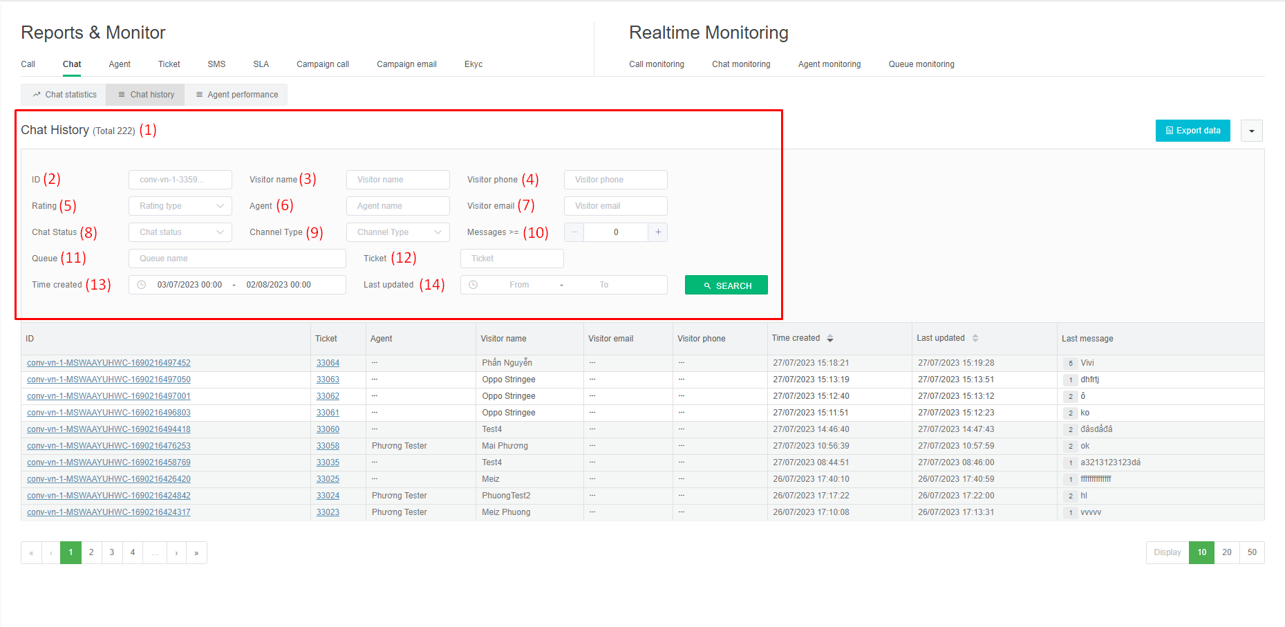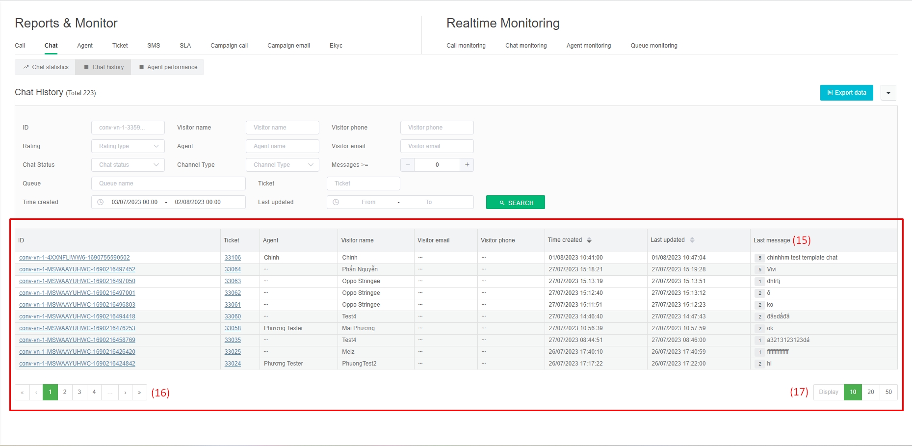 In addition to the information fields available in the chat history report filter, we have 3 more information fields (15), (16), (17).