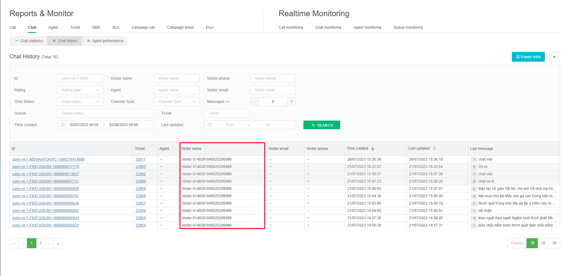 (3) Visitor name: Customer's name is entered into the system. For the Zalo OA chat channel, it will appear in the form of the Customer ID. In case the Customer has clicked on the Zalo OA of the business, the Customer Zalo name will be displayed.