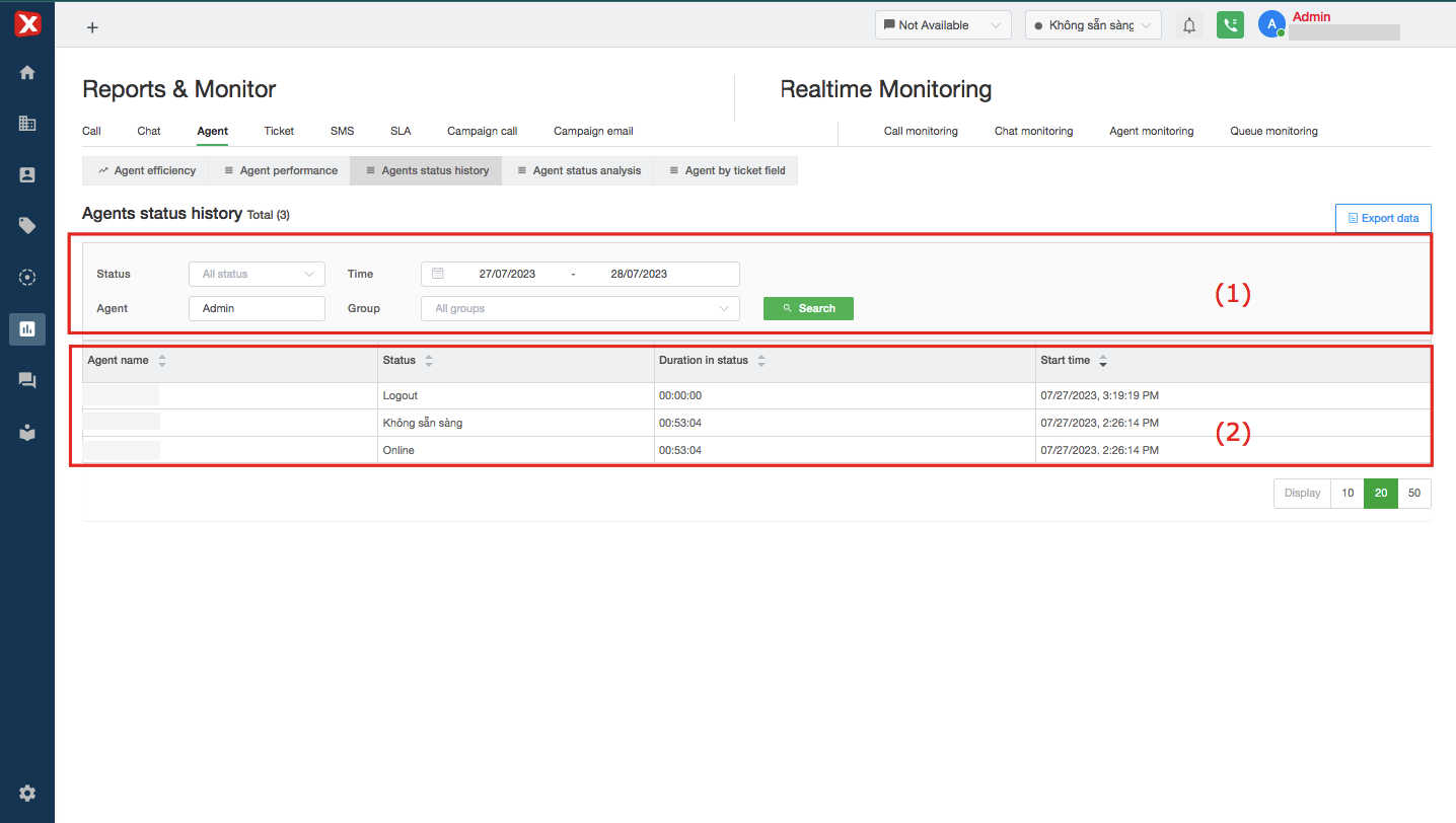 Agent status history report records status change history and corresponding time, helping management check working time and ready to receive calls