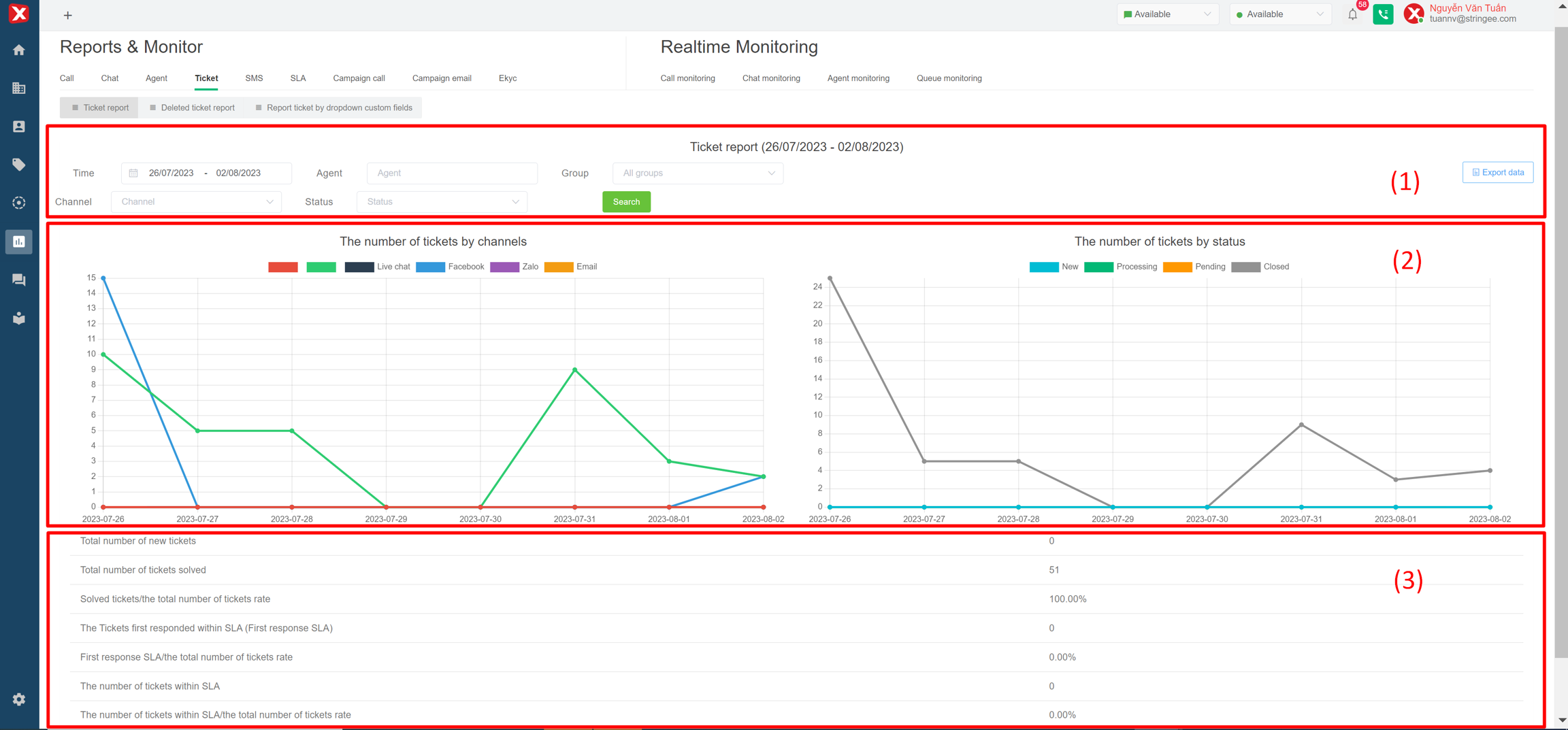 The ticket report visually reflects the number of tickets assigned to each generated channel and the ticket status, giving the manager a comprehensive view of the contact center system.