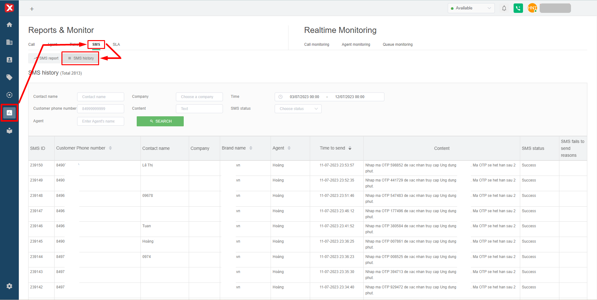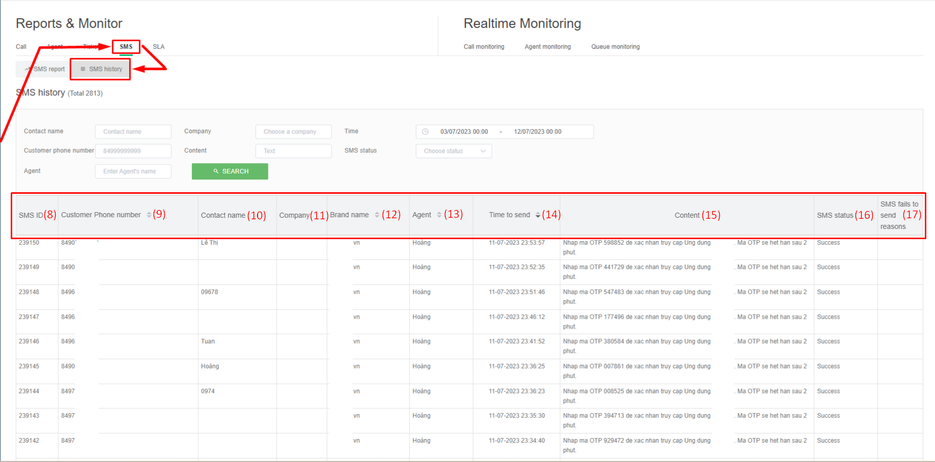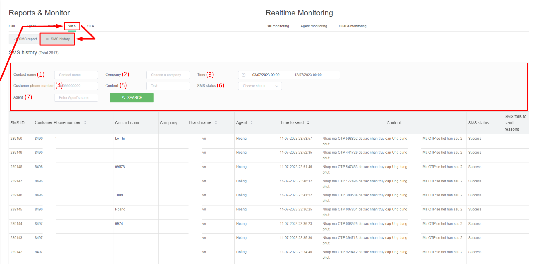 **(6) SMS status:** includes 2 statuses (Sending successfully and Sending failed).&#x20;