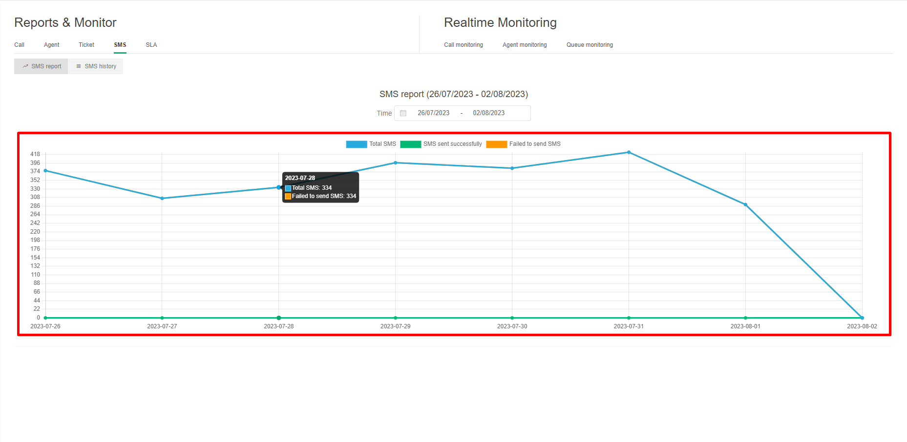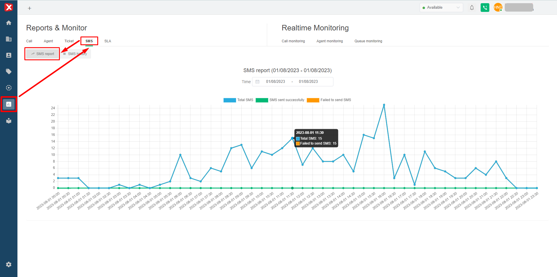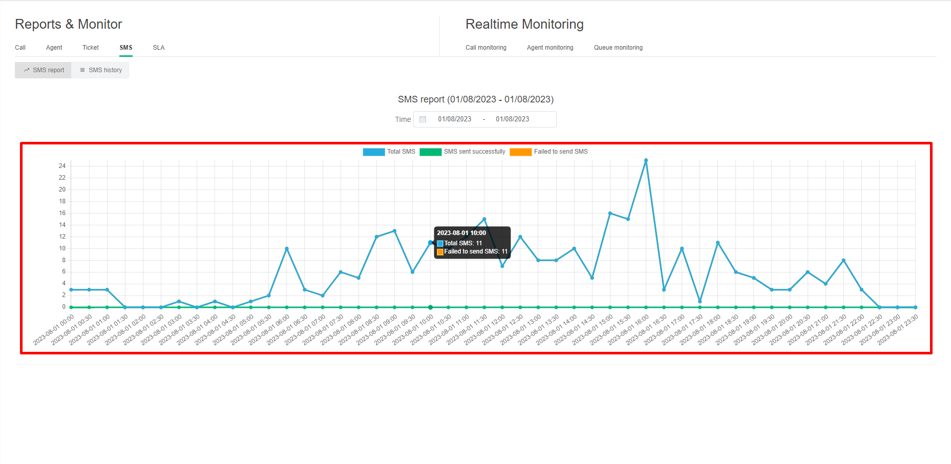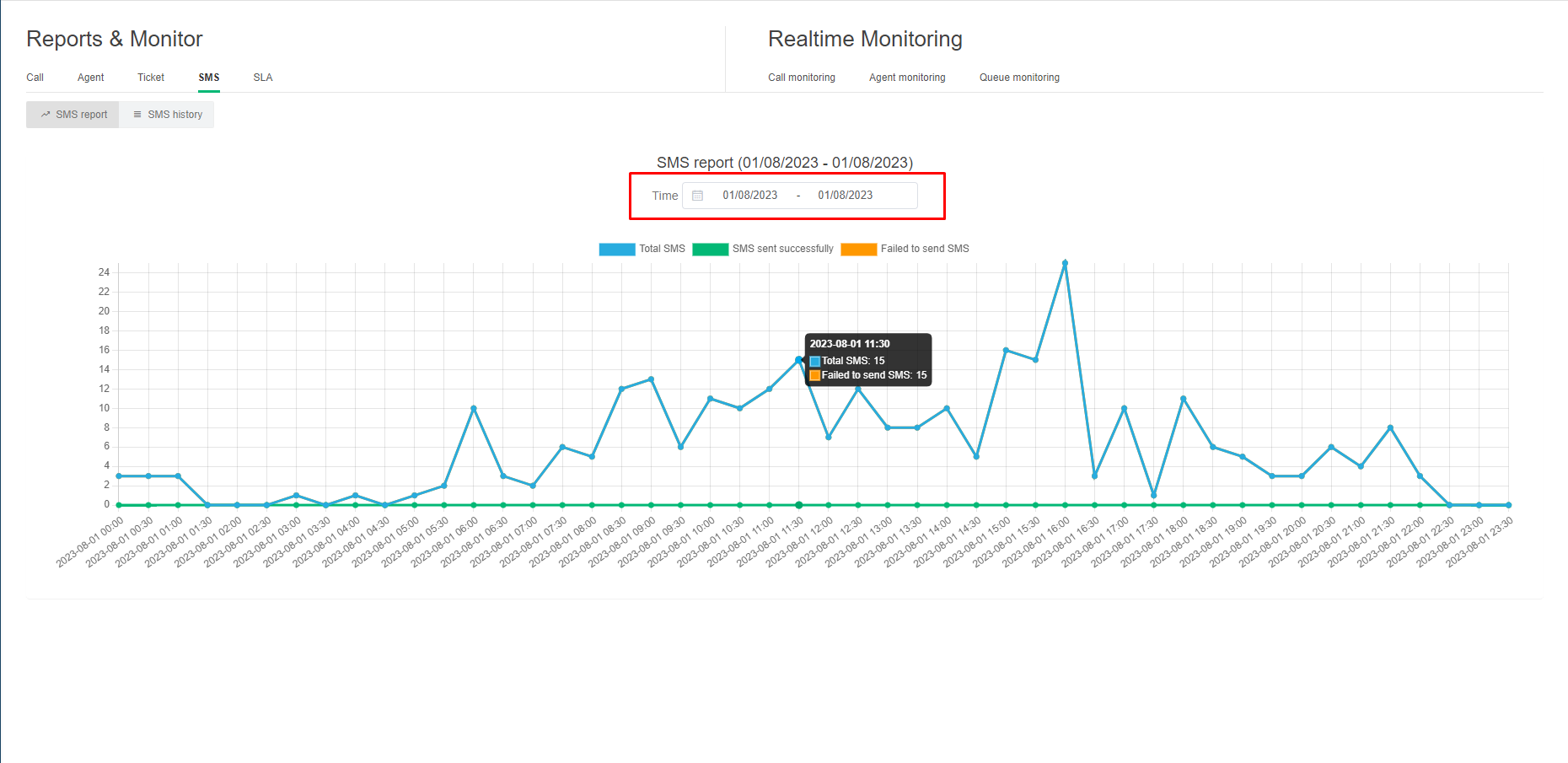SMS report chart within 1 day