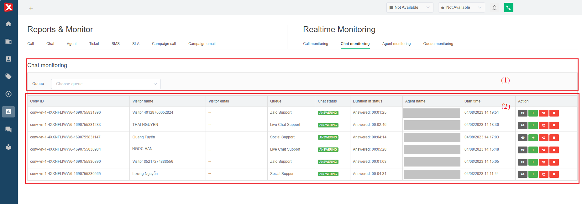 * **Action:** management interventions. *Note: supervisor/admin can only perform interventions on a chat that has been received by the agent (the status is answering).*&#x20;
