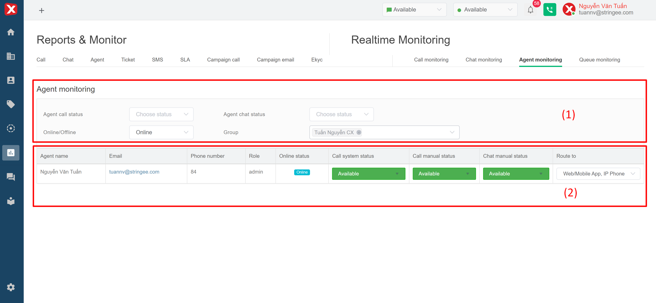 Monitoring information includes the agent presence on call, the status of manual call configuration, the status of manual chat configuration, change agent status