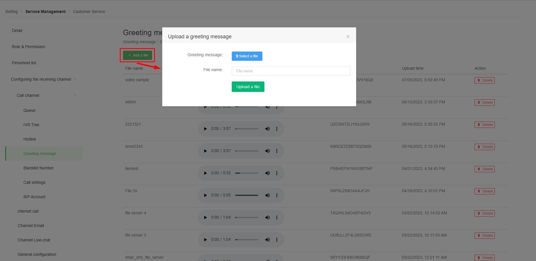 Select the greeting file: the user will select the appropriate audio file on the computer device with the correct format (mp3, wav) as specified by the system and proceed to upload.