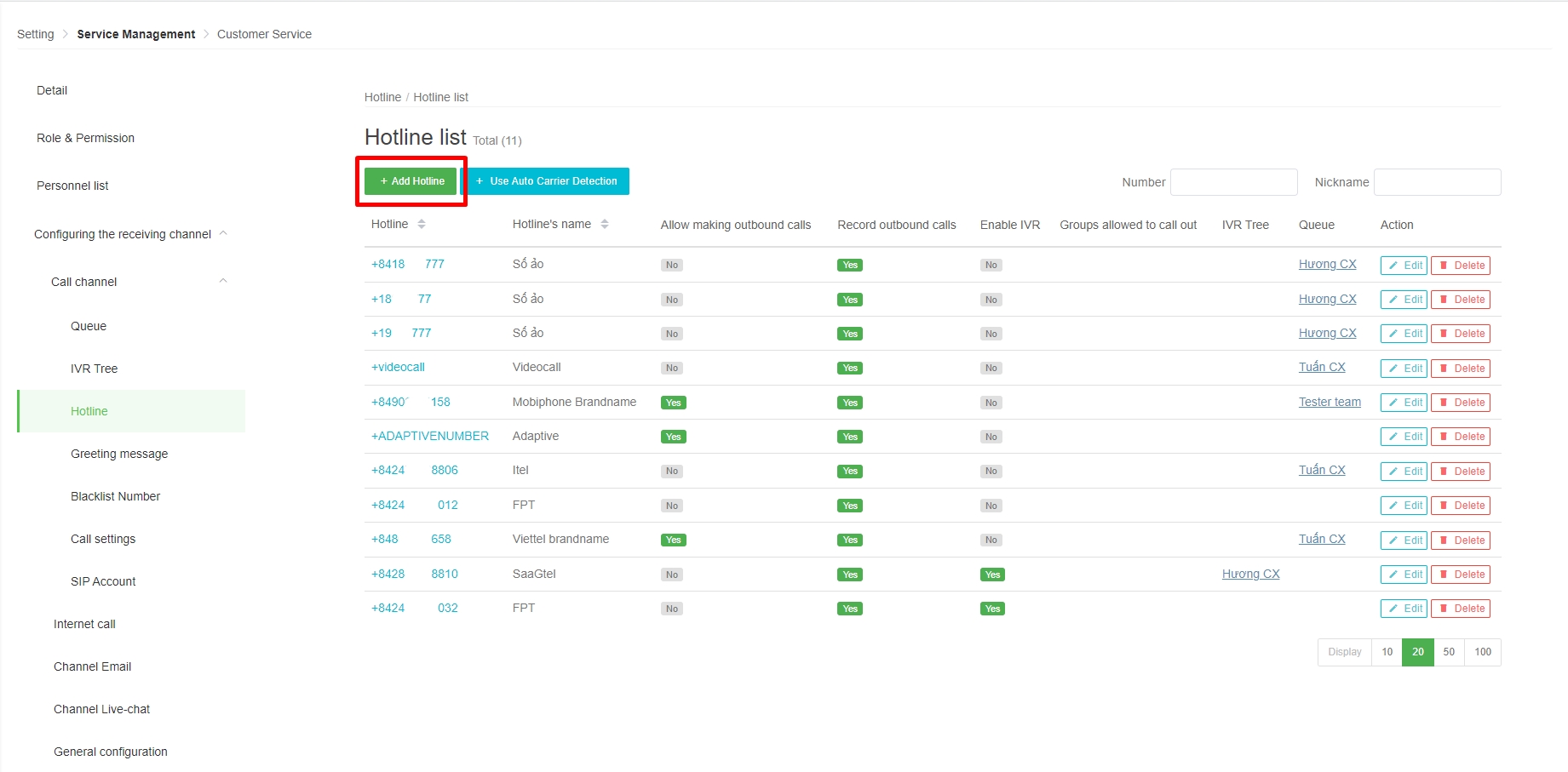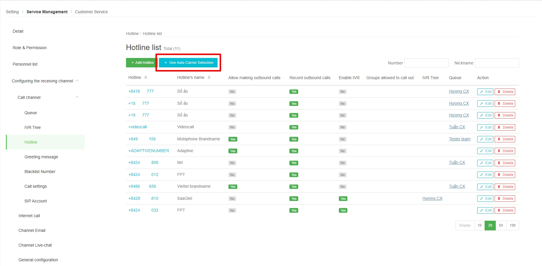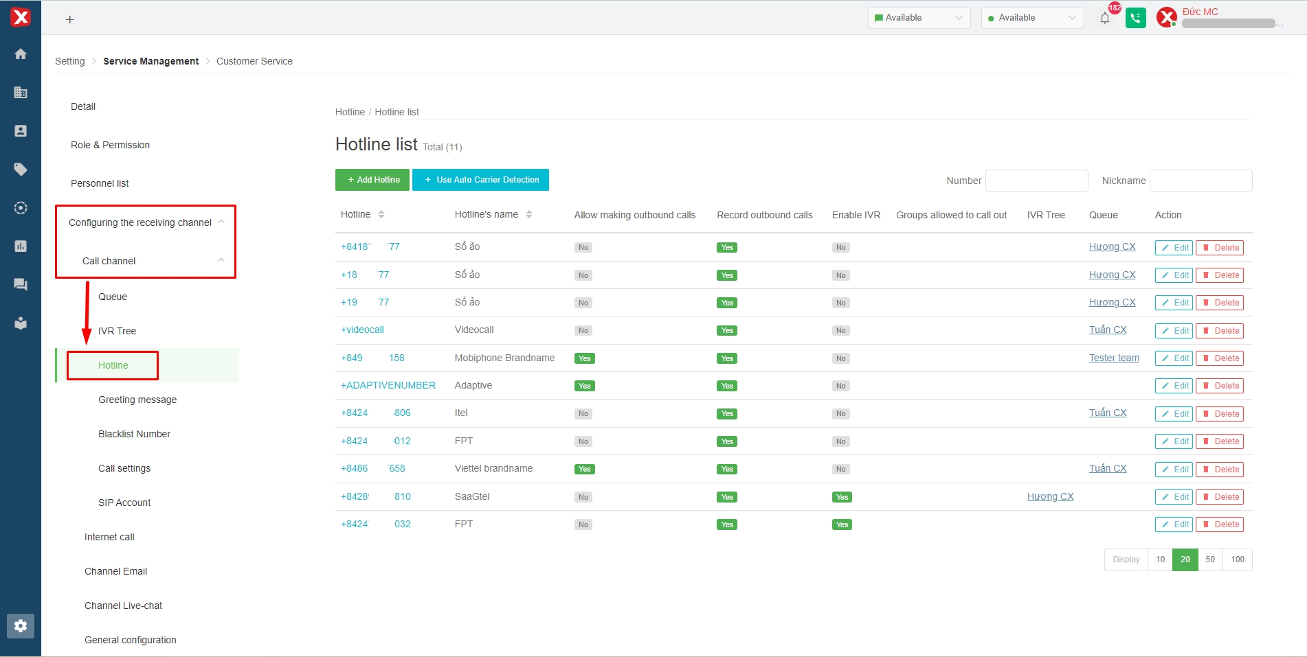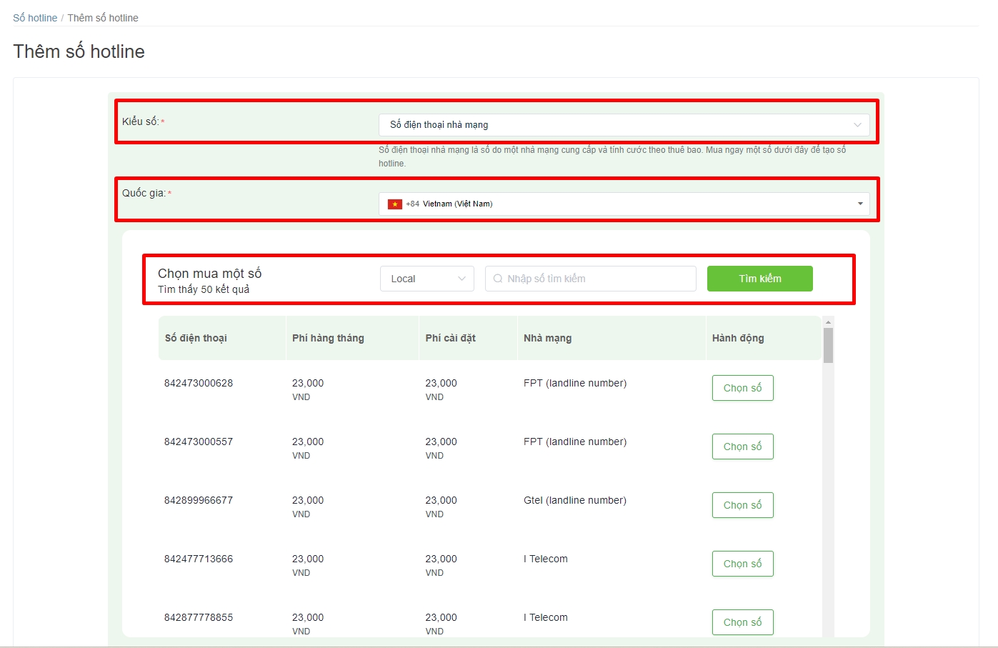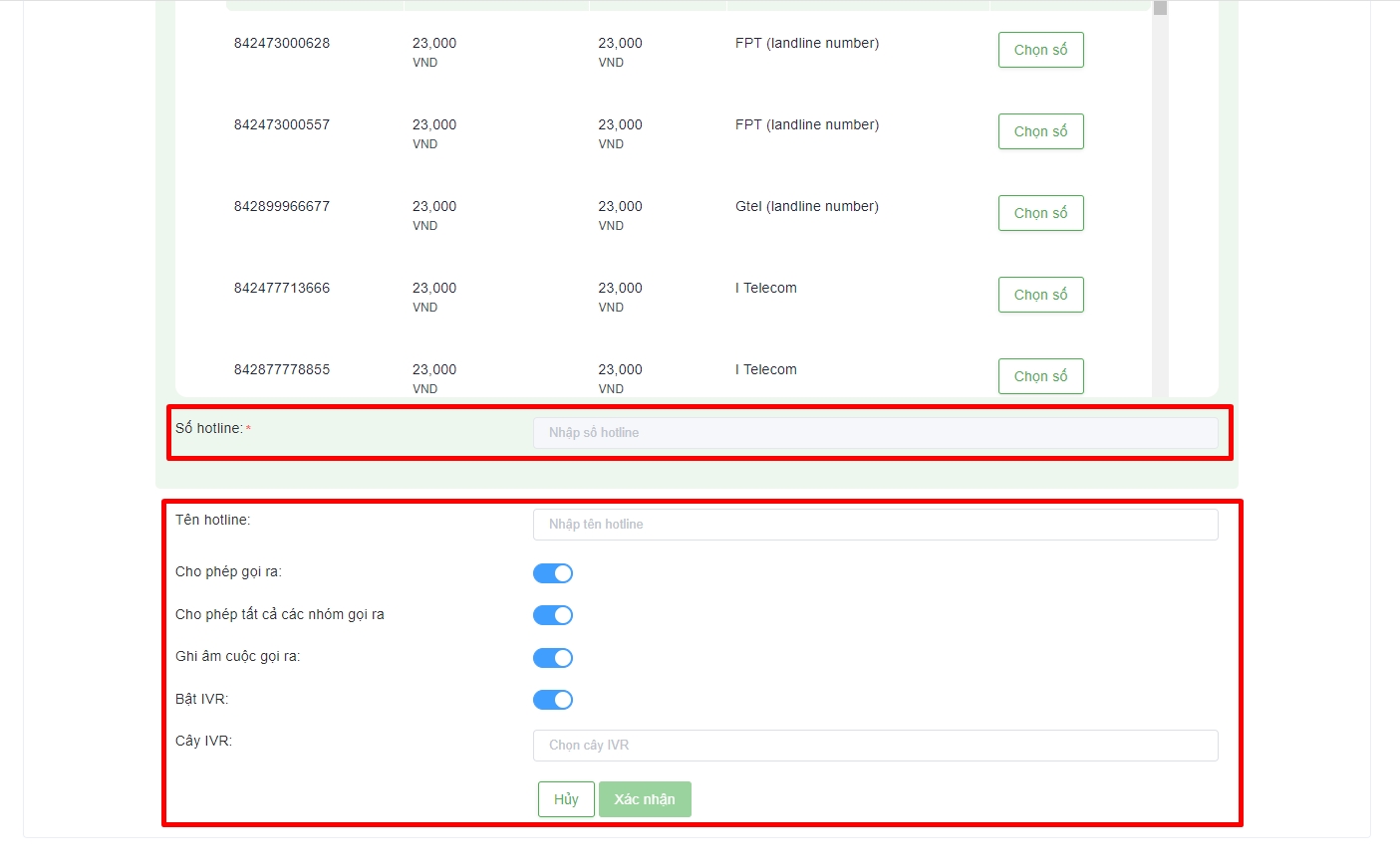 Example: Users need to call out to customers using Viettel's phone number, then the system will automatically select the hotline number of Viettel network to make calls. If the system does not have a hotline number, Viettel will randomly choose or a designated hotline number of the system to call out.