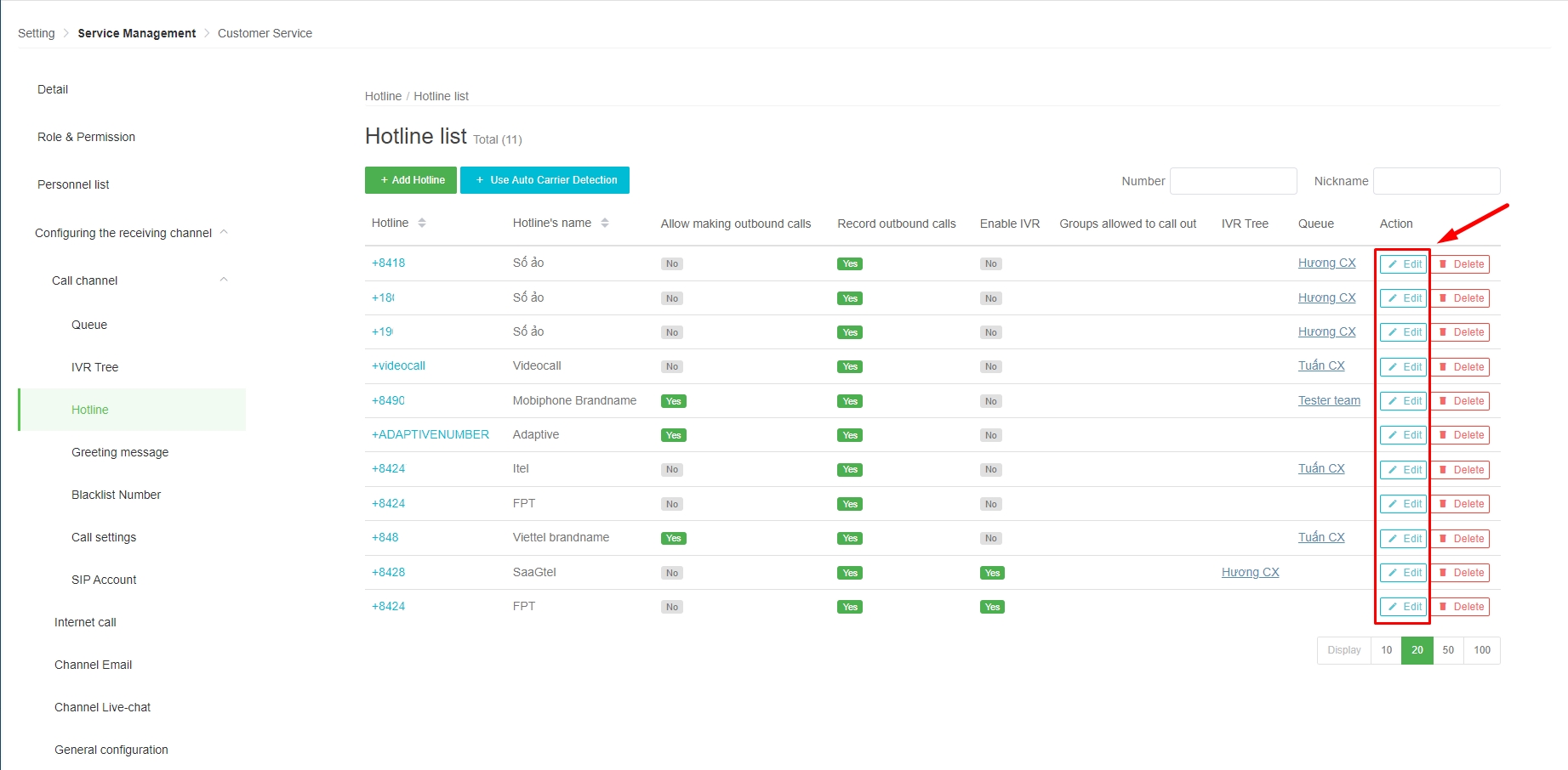 To configure details for a hotline number. Users will click on the item to edit the hotline number at the interface.