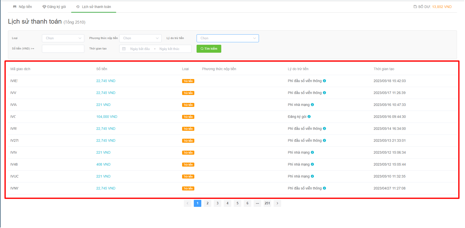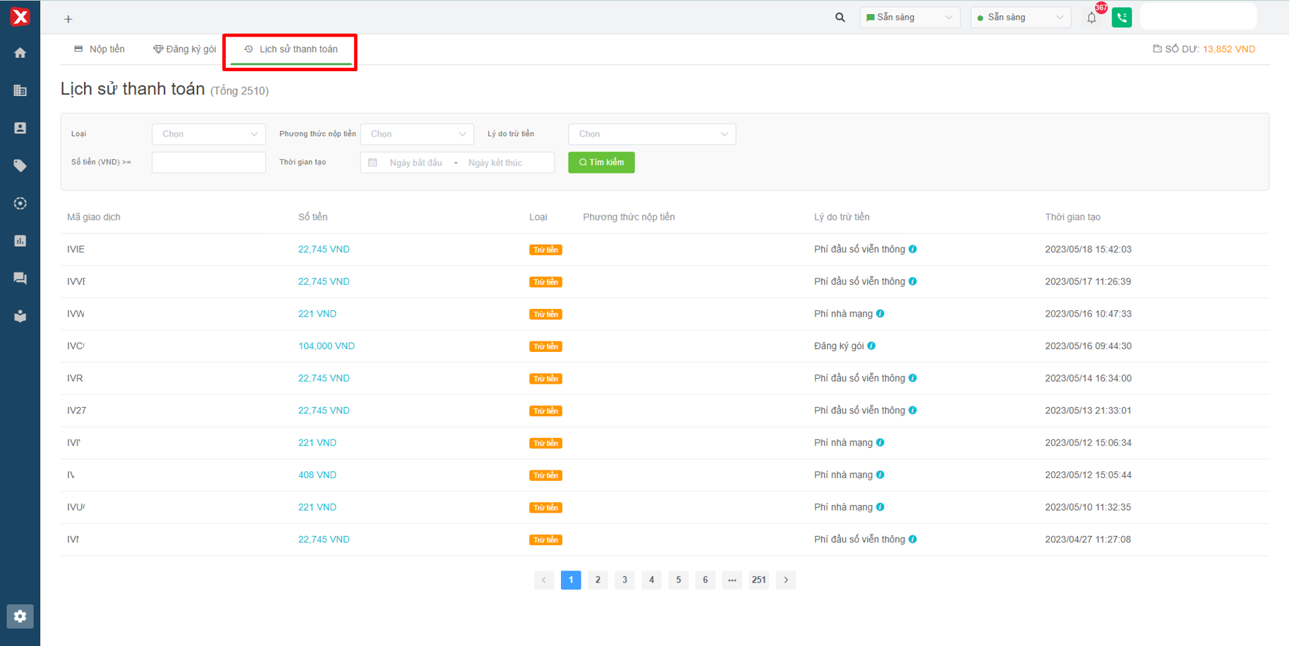 * **Type:** [deposit](https://help.stringeex.com/stringeex-tong-dai-cham-soc-and-quan-ly-khach-hang/en/ii.-system-features/9.-settings/9.10-payment/9.10.1-topup) (top up Portal) and deduct money (deduct from the balance available on Portal).&#x20;
