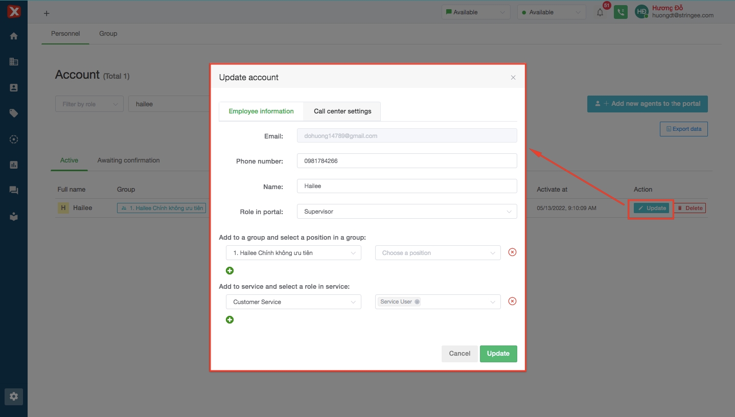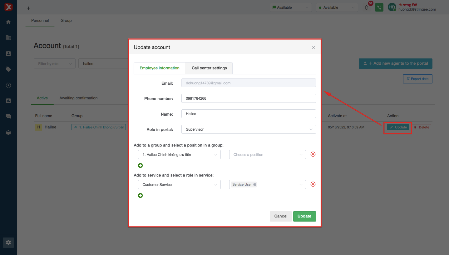 Role in the portal: the role of personnel after accepting the invitation (Admin - supervisor - agent).