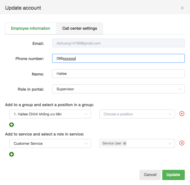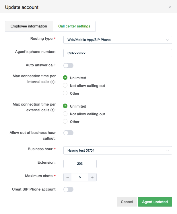 Agent's phone number: agent phone number, if "Drop incoming call" is Agent phone number, this field is required, number format is 84xxxxxxxxx.