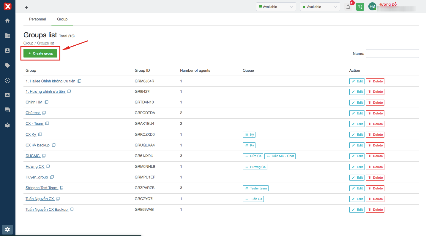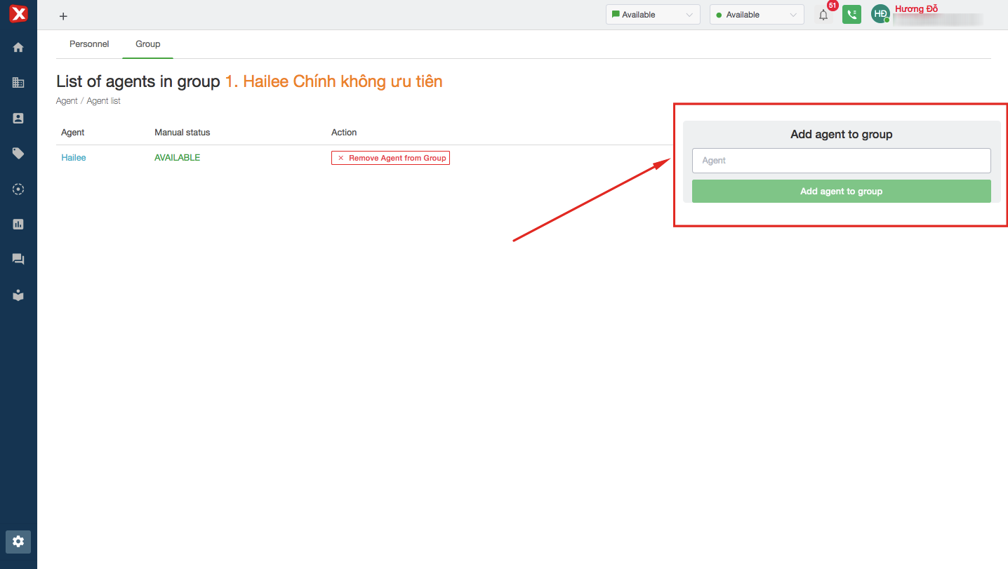 After creating a new group successfully, admin add agent to group. Click the group's name, then have a popup to add agents.