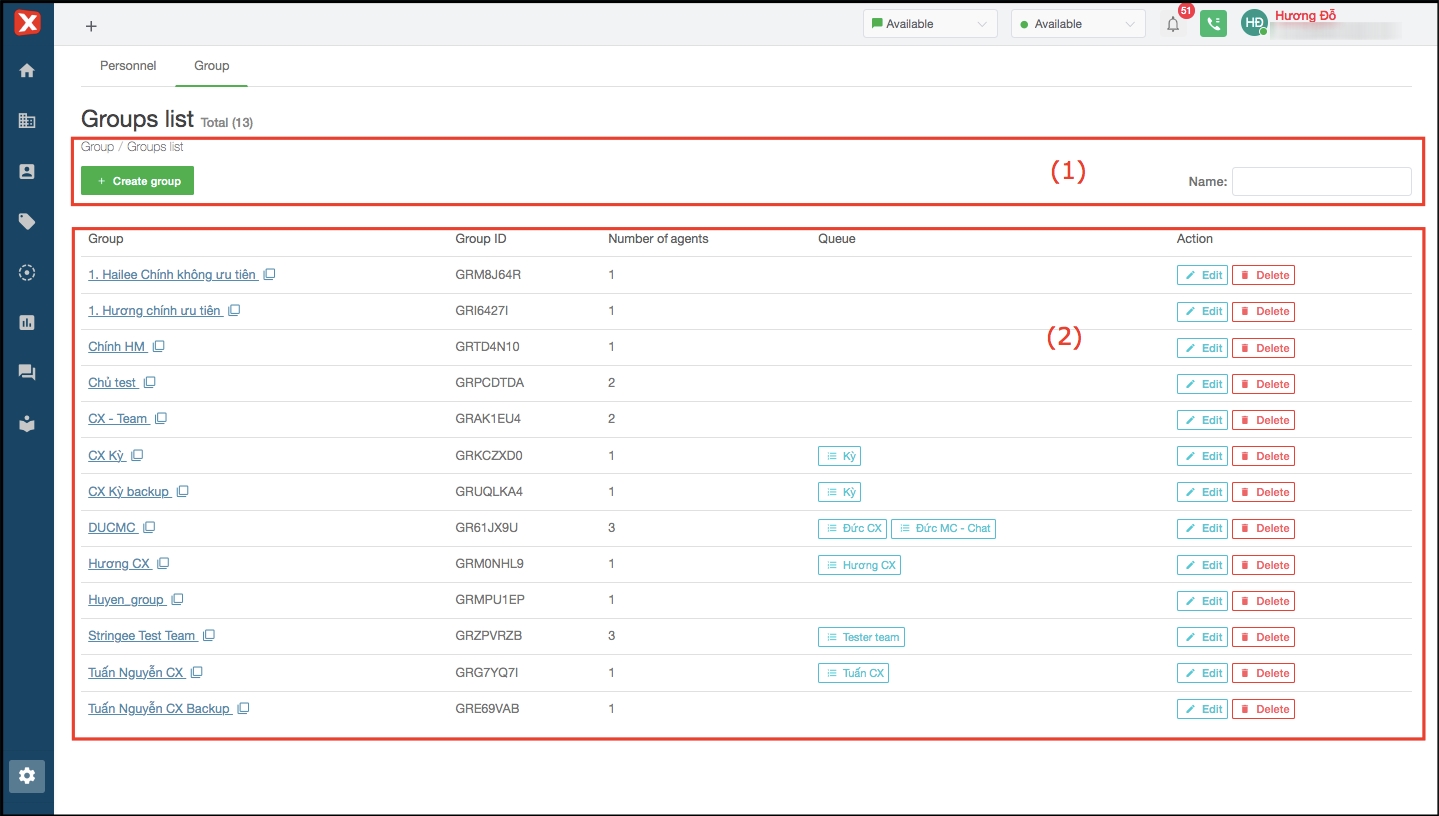 Create group: create more groups on portal. Admin can click on the box to create a group, enter the group name on the popup that appears and click "Create group" to confirm creating a new group with the name just entered.
