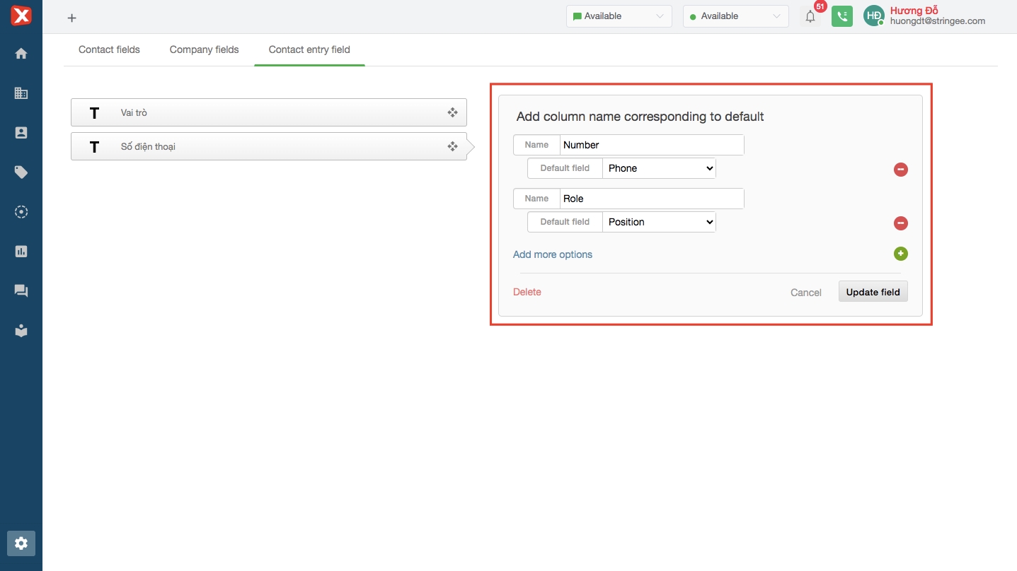 Here, the admin can map the information with the title in the self-created upload file with the system's contact information fields. For example, in the image, the field named "Phone number" when uploading a contact will correspond to the "Phone" field on the system. The field named "Role" will correspond to the "Position" field on system