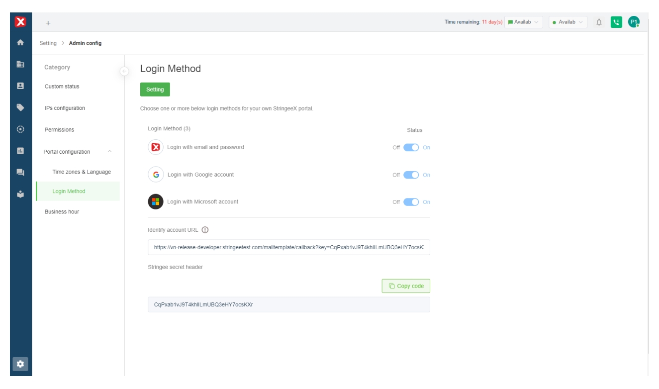 Stringee secret header: Used to verify whether the login information is sent from your portal or not. (You can click the Refresh icon to generate a new code.)