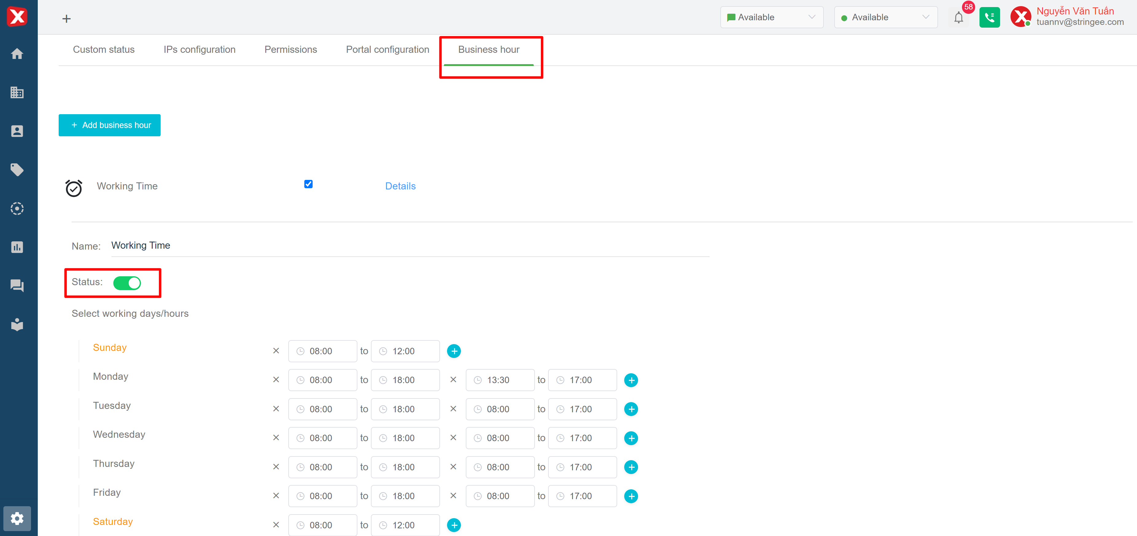 Admin can create/edit "Working time" to fit the needs of each queue in the system. Admin can customize the time frames of each day of the week. After creating/editing, users click Update to save. Note: a “Working time” is activated when the status of this “Working time” is enabled (the button turns green).