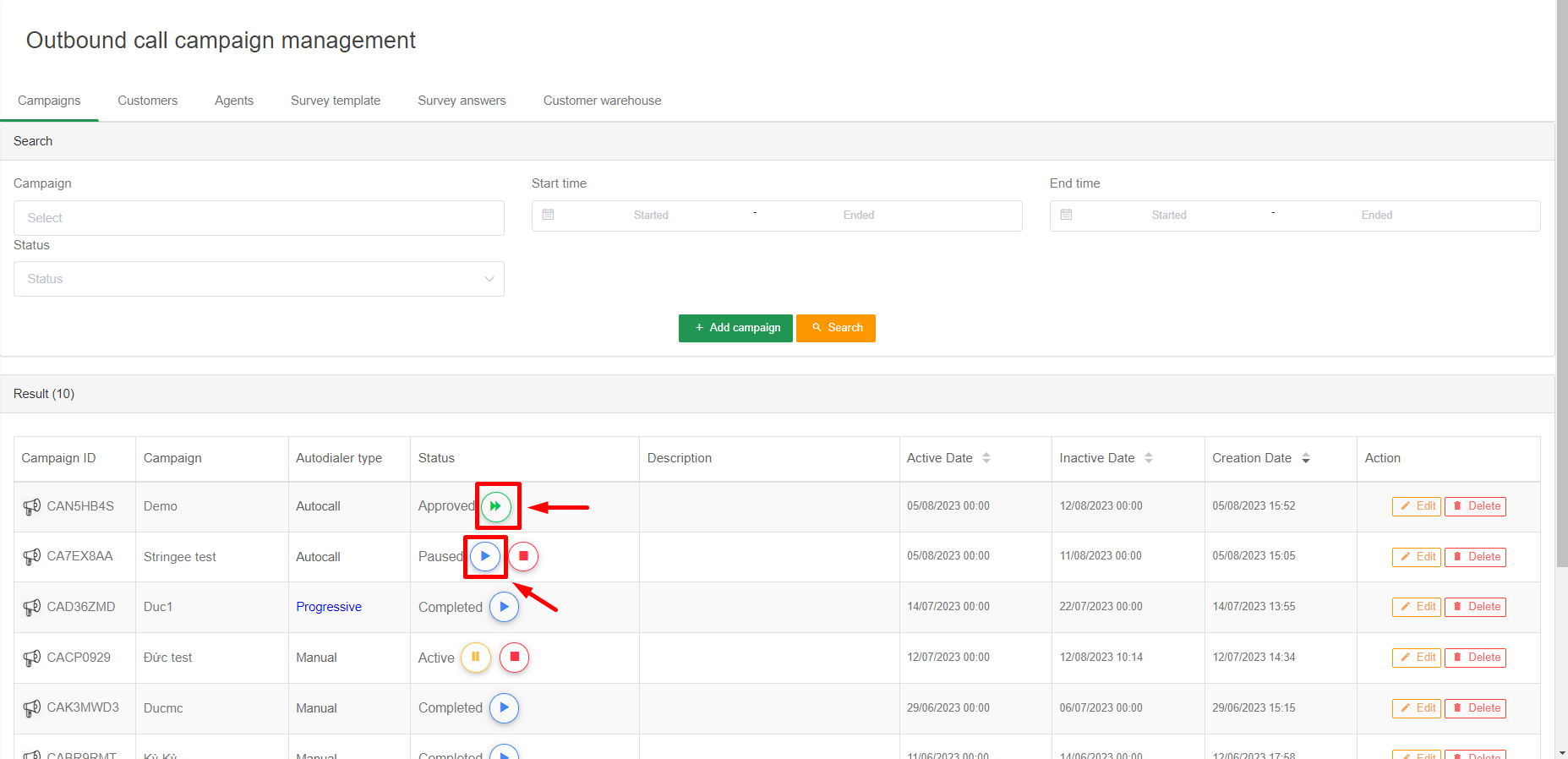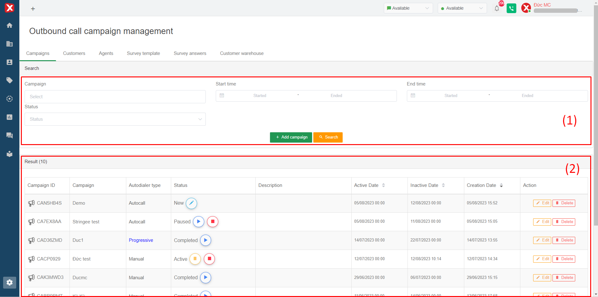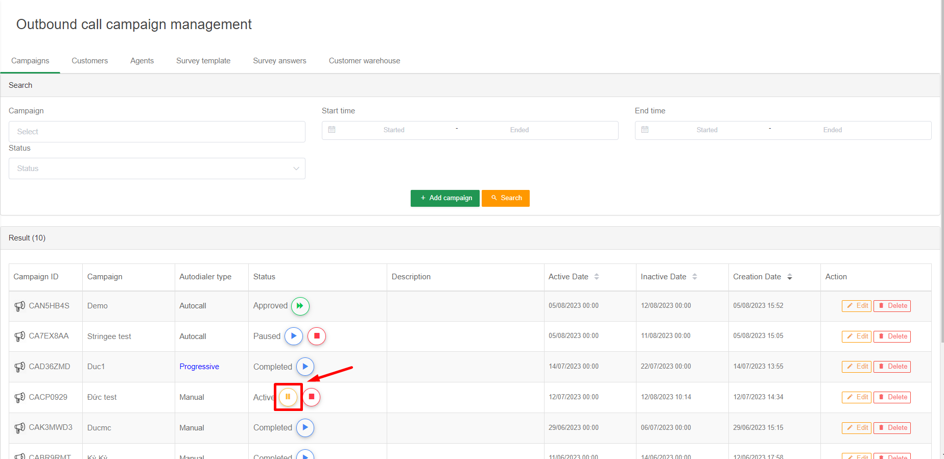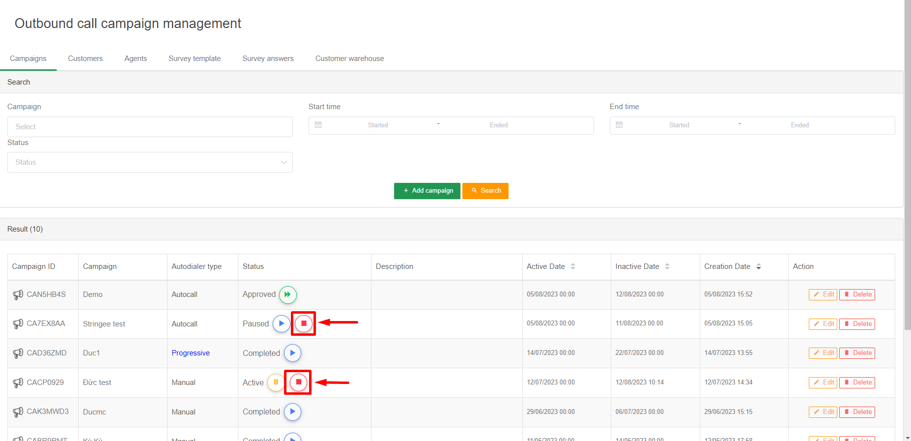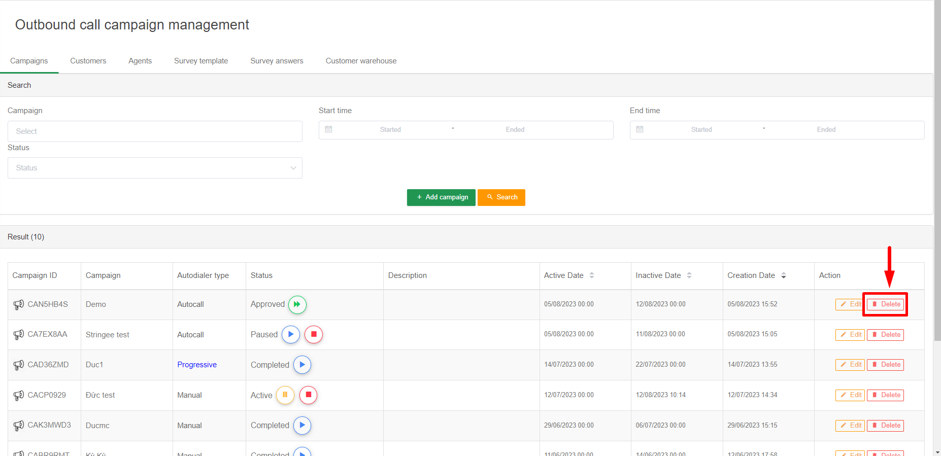 Admin can delete a campaign by clicking Delete. Note, after deleting a campaign, campaign data such as agent, customer, report is no longer on the portal.