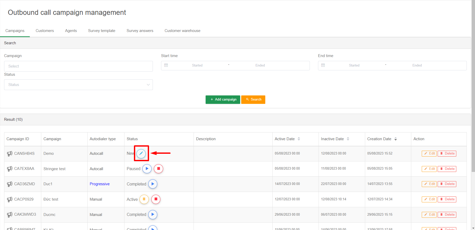 Admins can edit some configurations of an undone campaign by clicking the Edit action. The configurations allowed to edit include: campaign name, campaign description, start time, end time, hotline number, working hours, maximum number of calls, break time between two calls (minutes) , no-callback time (date), call type,....