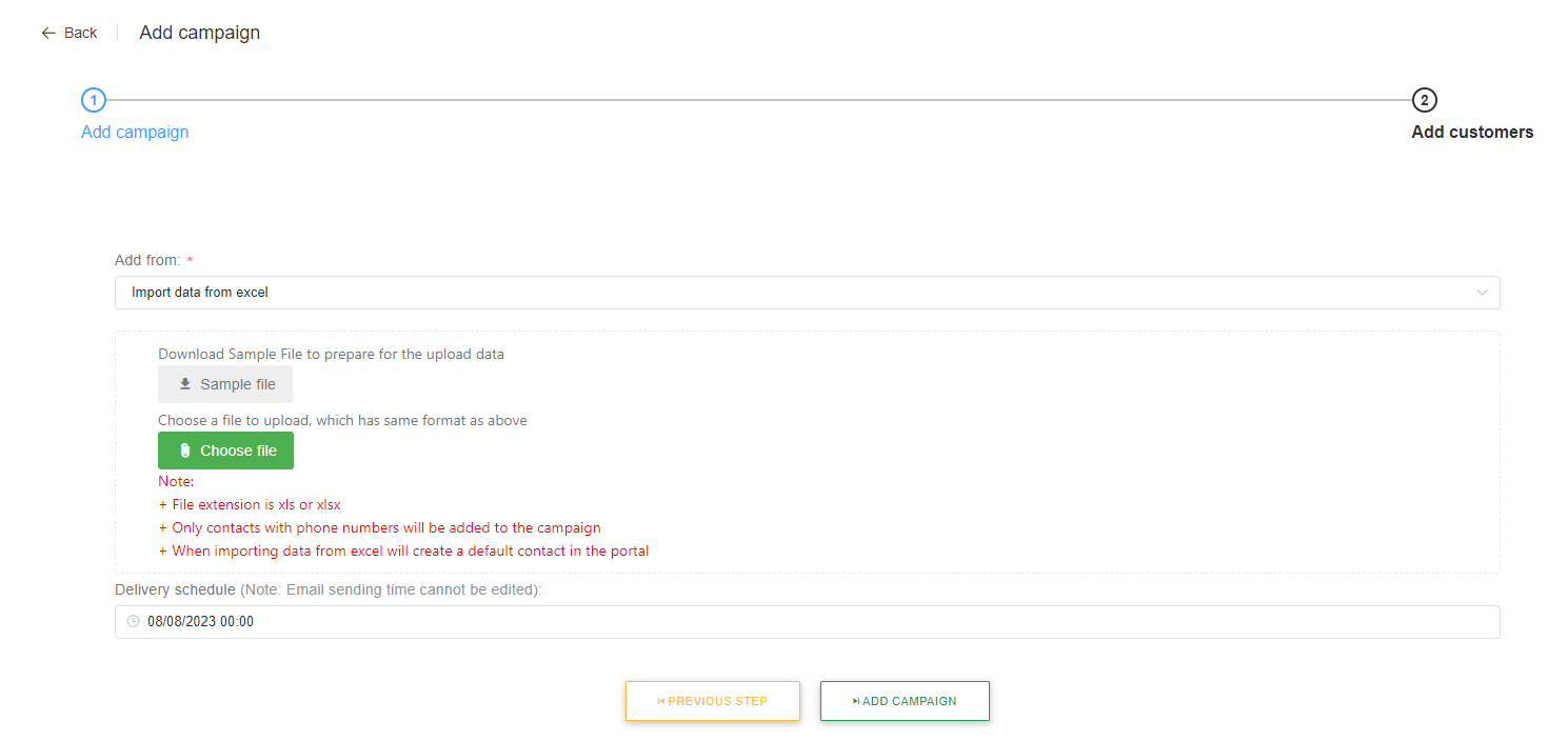 Add from: choose to add customers from one of three sources (Contact, Filters and Import data from excel)