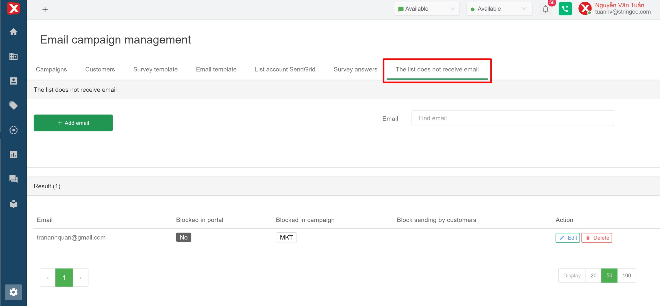 Note: If the customer receives an email and chooses to Unsubscribe or put it in spam, the customer's email will be automatically added to the do not send email list. Admin can't edit, delete this email in the list.