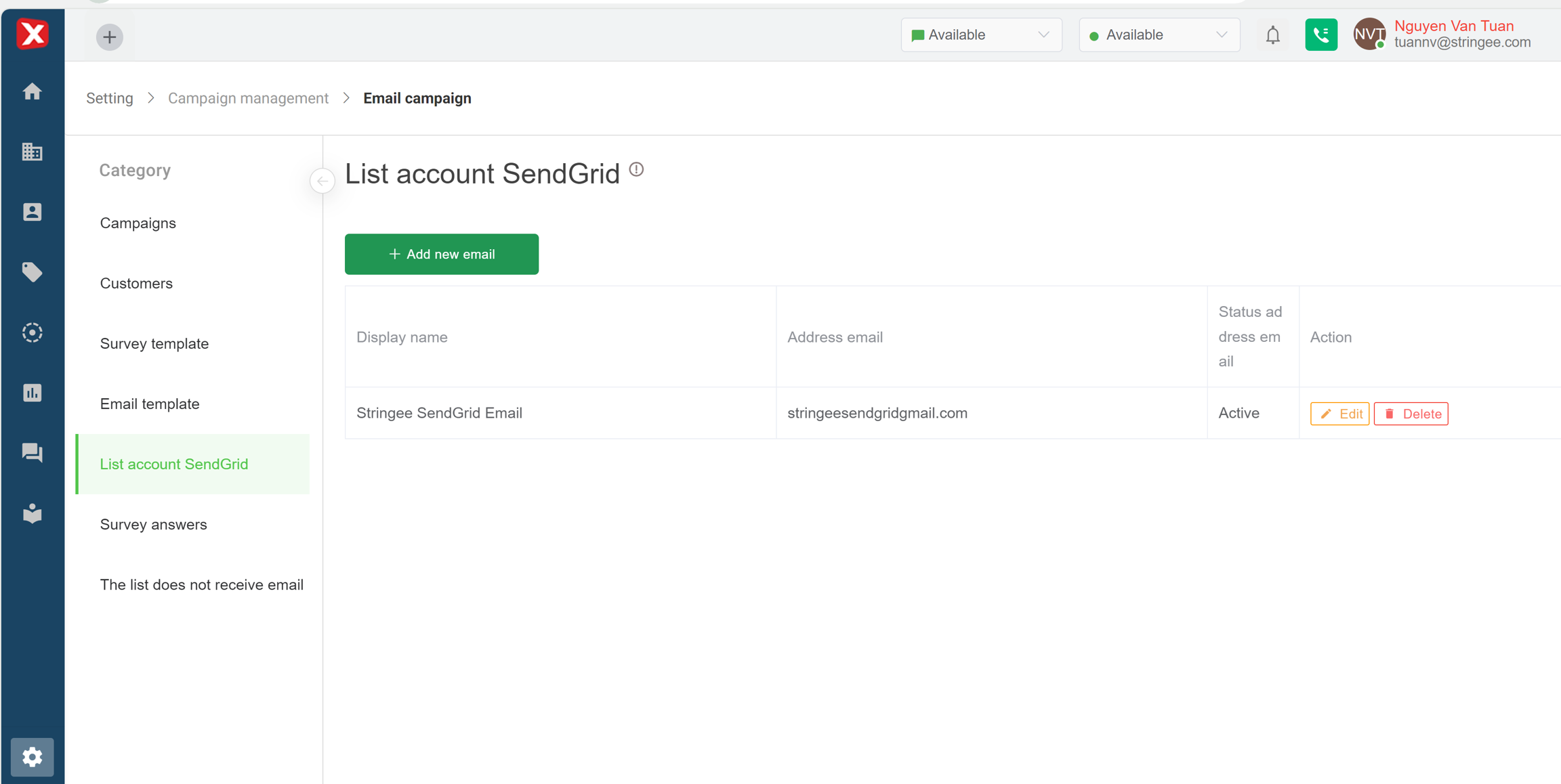 Email campaigns are sent from Sendgrid email or SMTP. With Sendgrid email, admin needs to add a Sendgrid account according to the following instructions: