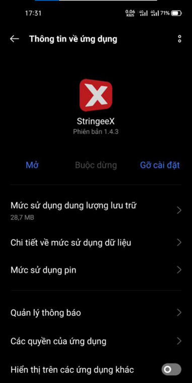 * **Step 1:** Go to Settings => Application Management => StringeeX (Depending on each device line, this path may be different)