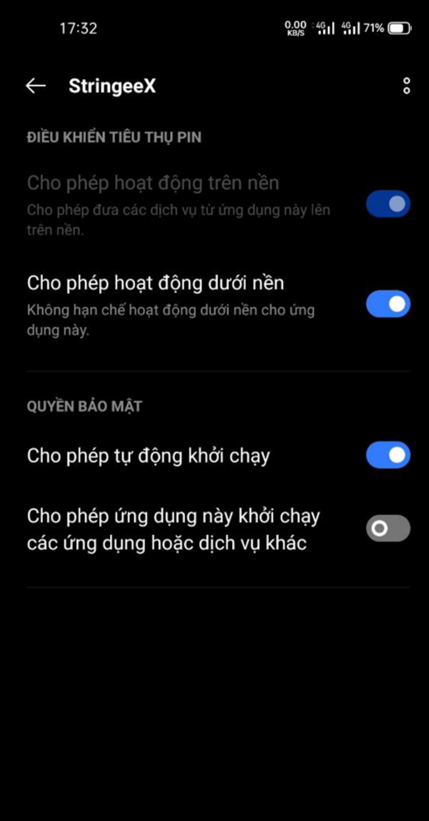 Do đặc trưng các hãng sản xuất điện thoại khác nhau nên giao diện giữa các thiết bị có thể khác so với minh hoạ, mục đích cuối cùng của hướng dẫn là cho phép ứng dùng StringeeX có quyền chạy trên nền, thông báo khi tắt máy và quyền tự khởi chạy